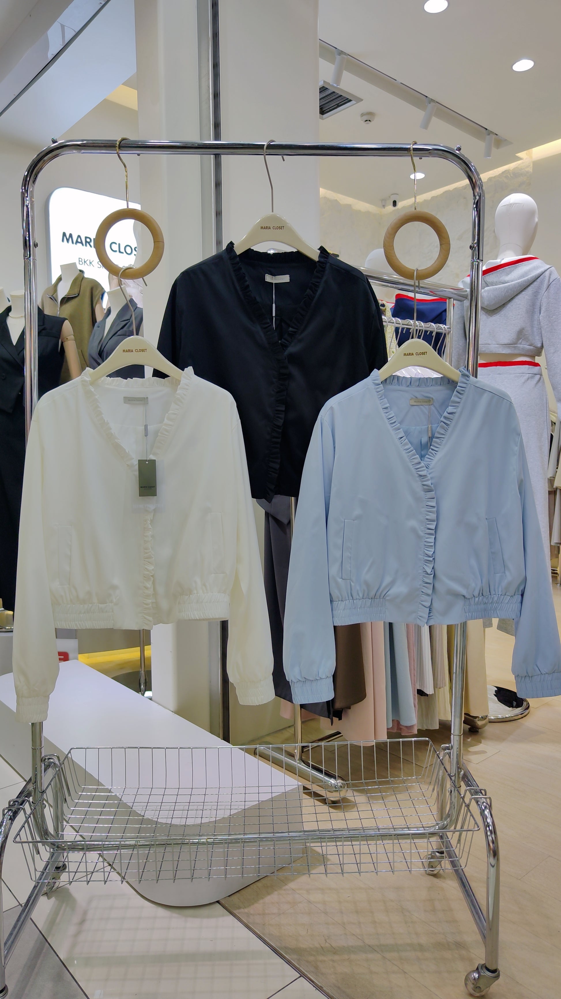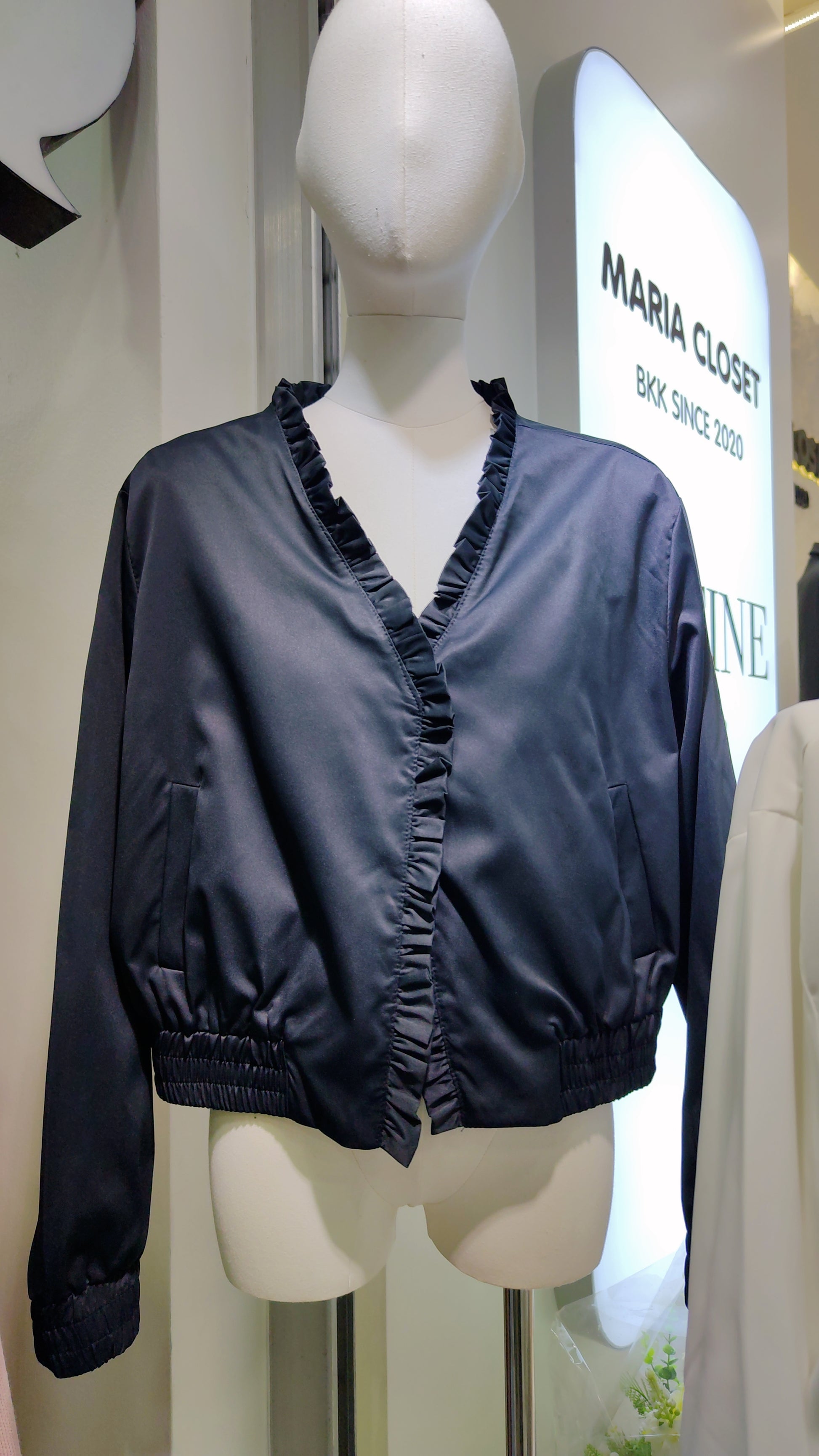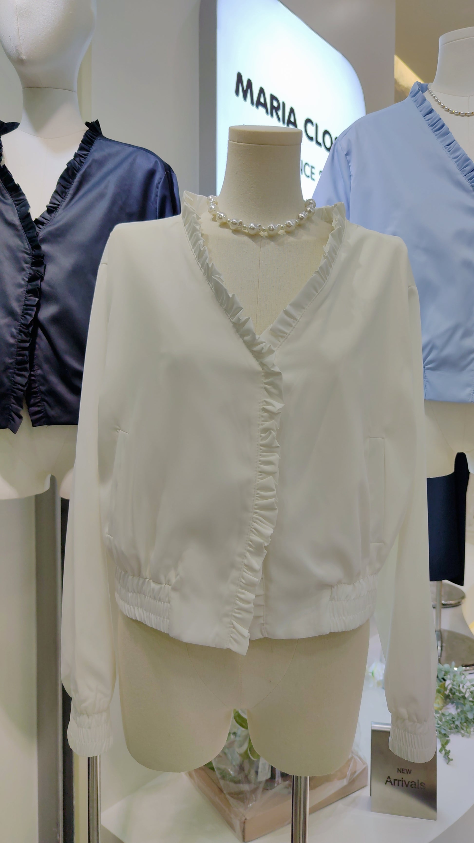 Details: A long-sleeved, cropped bomber-style jacket. Features a V-neckline with a delicate ruffle trim along the opening, an elasticated hem and cuffs, and two side pockets.