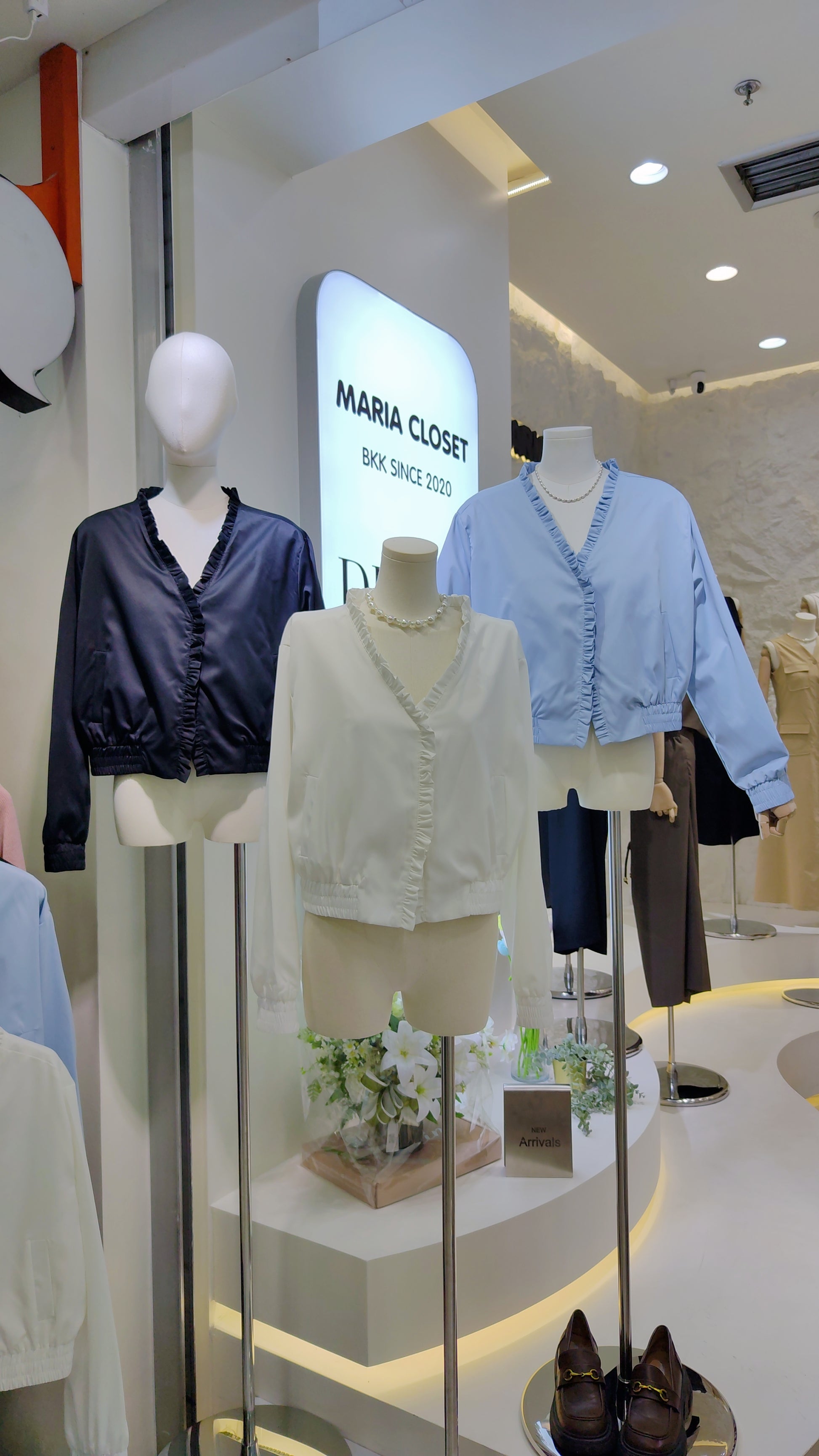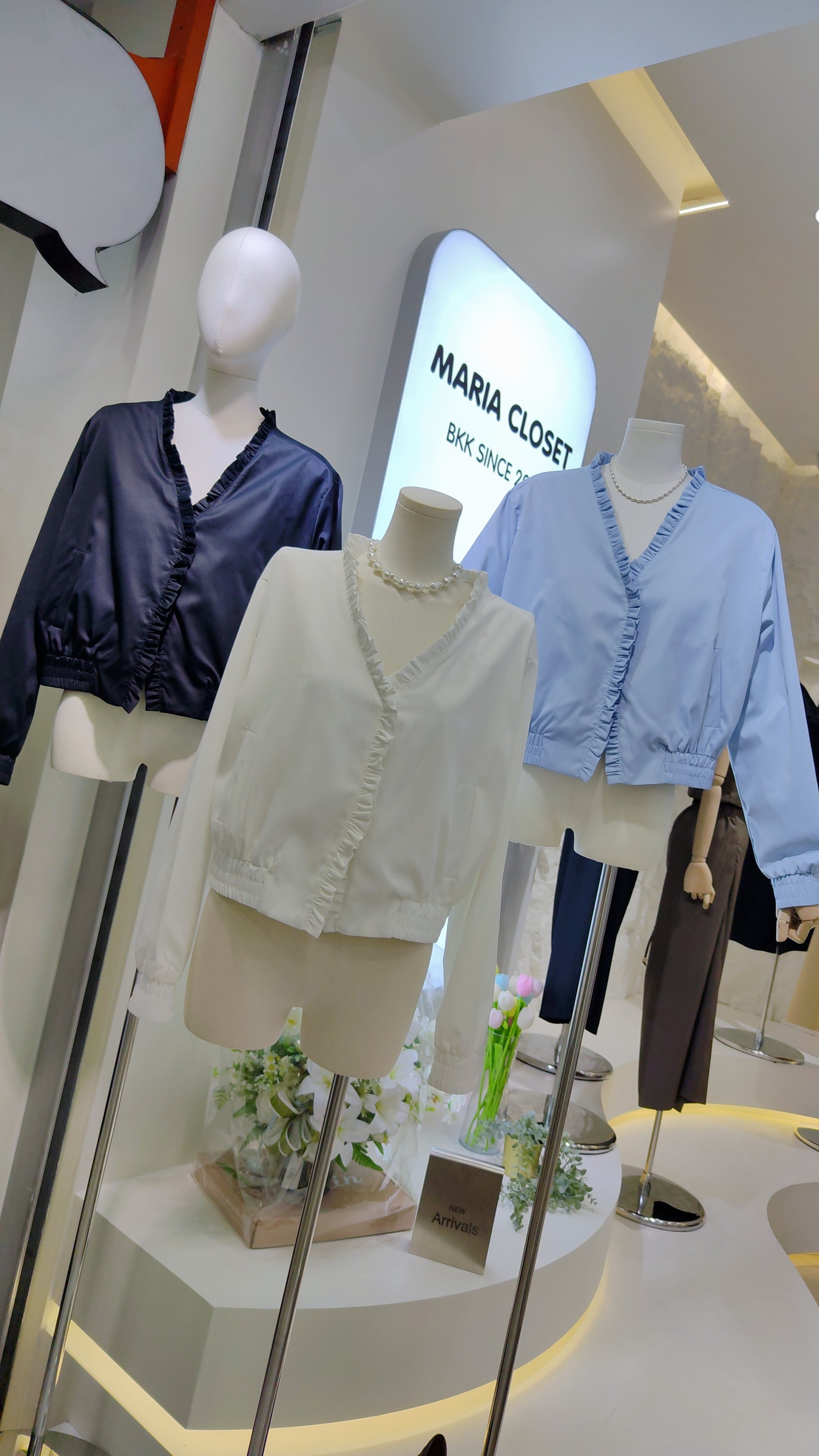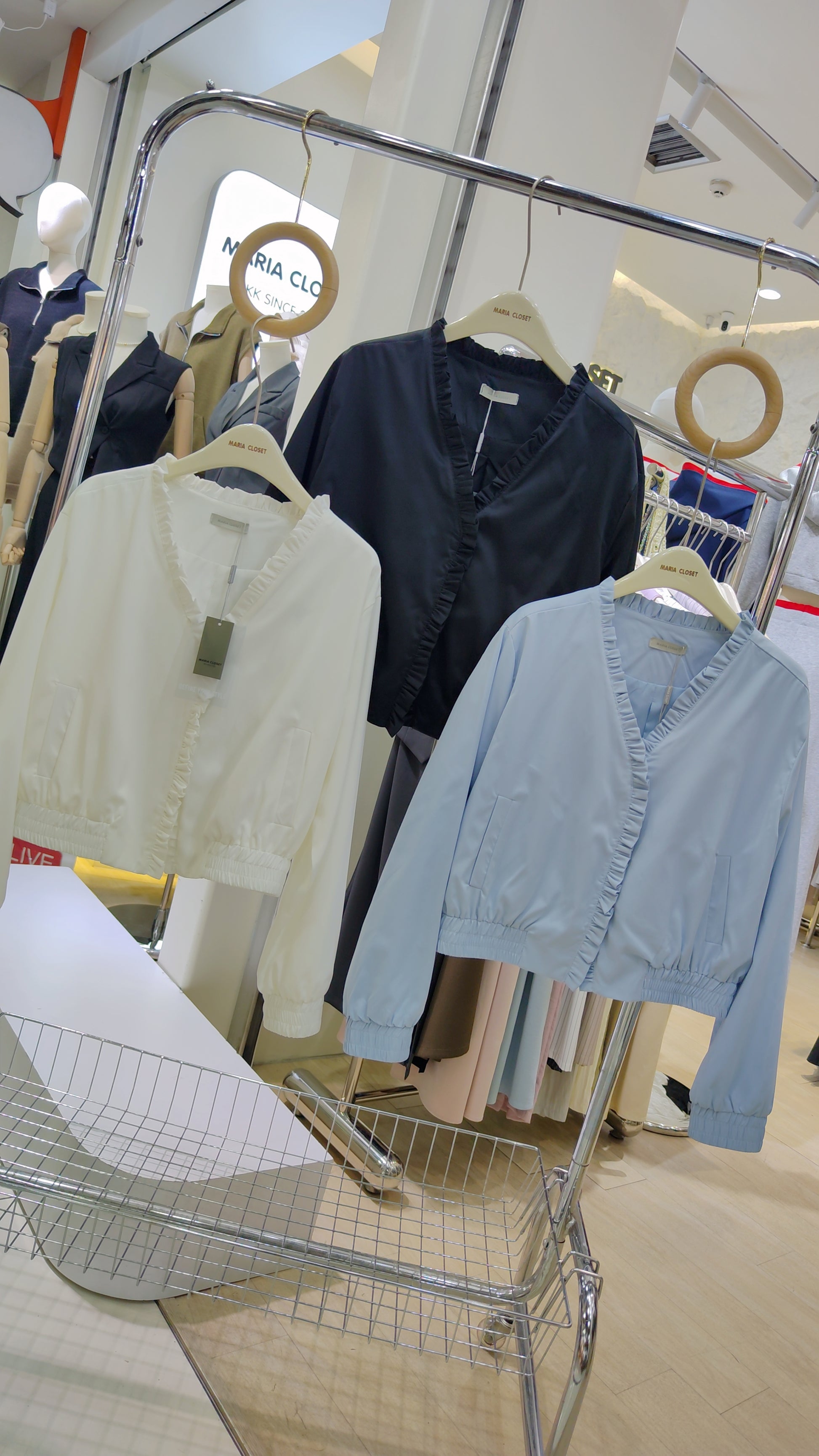 Details: A long-sleeved, cropped bomber-style jacket. Features a V-neckline with a delicate ruffle trim along the opening, an elasticated hem and cuffs, and two side pockets.
