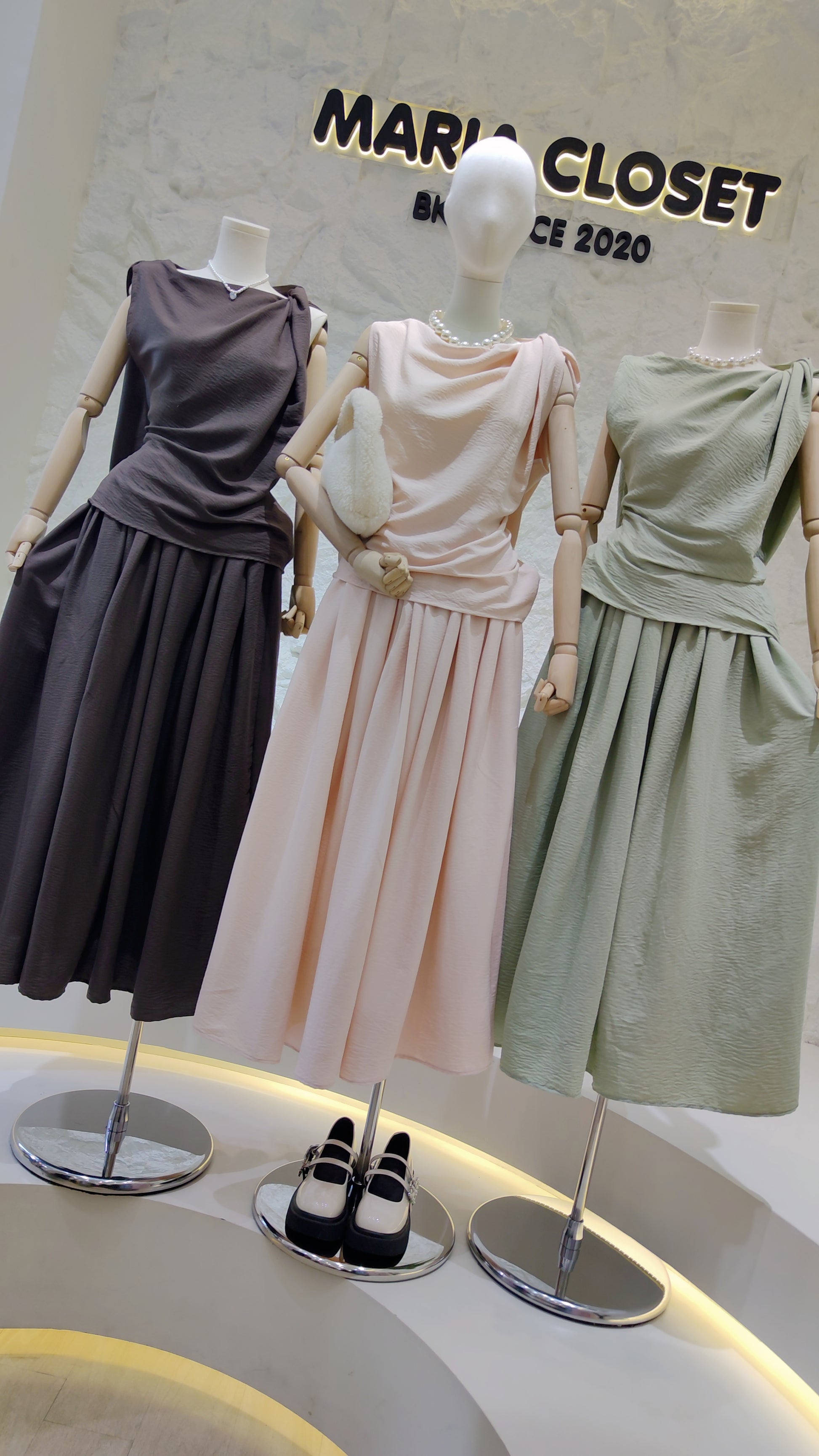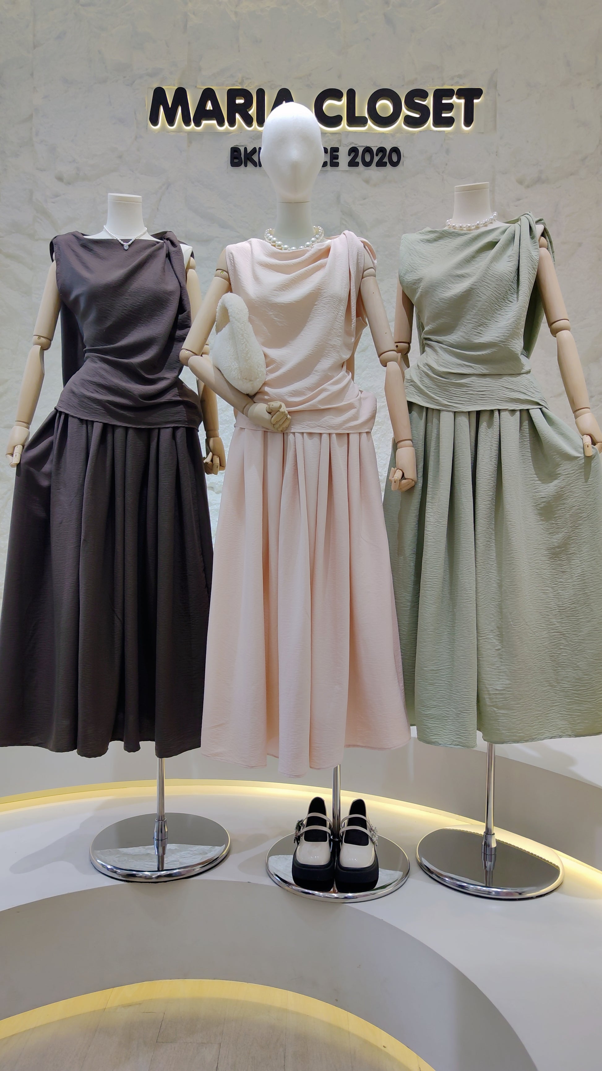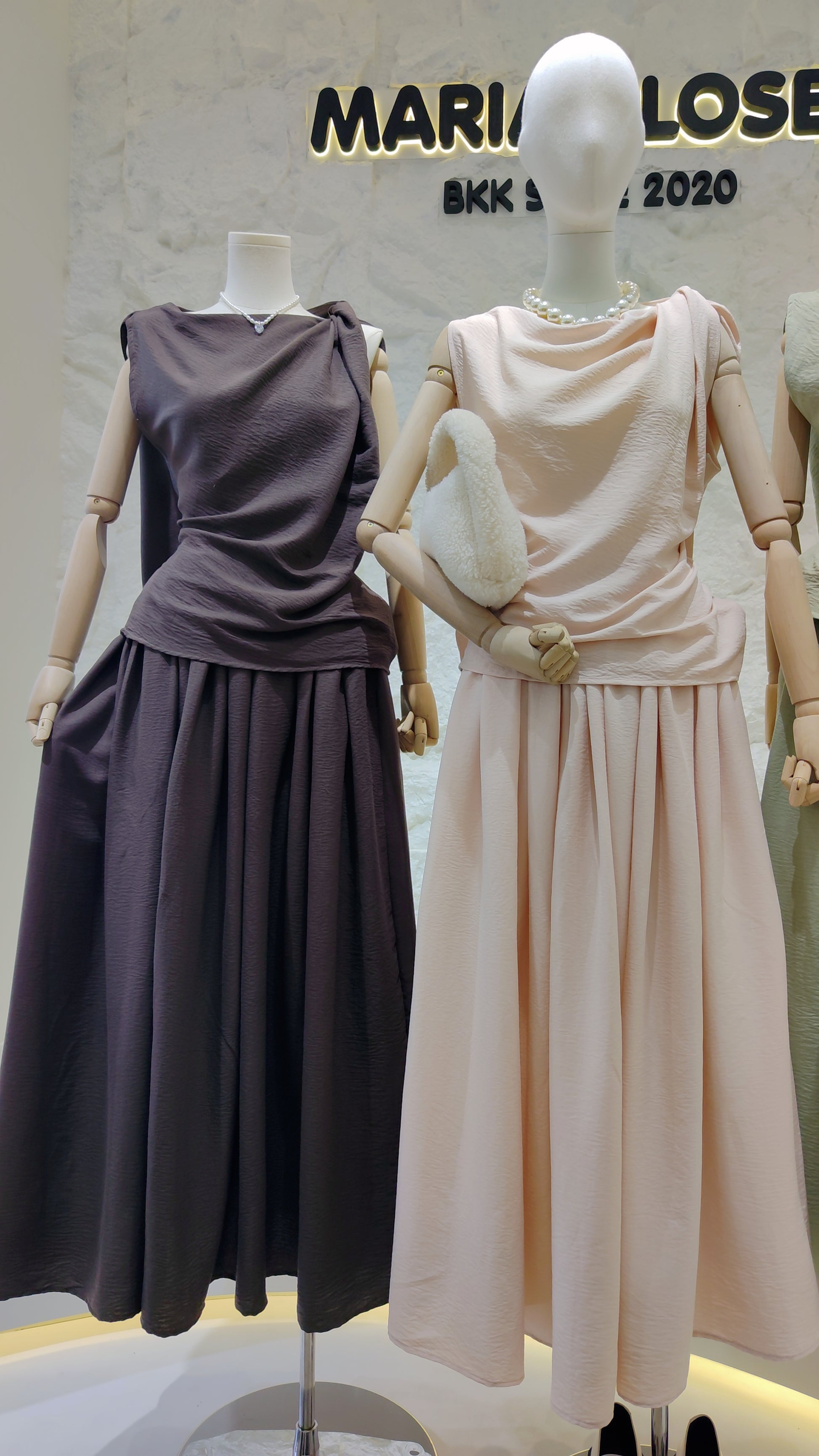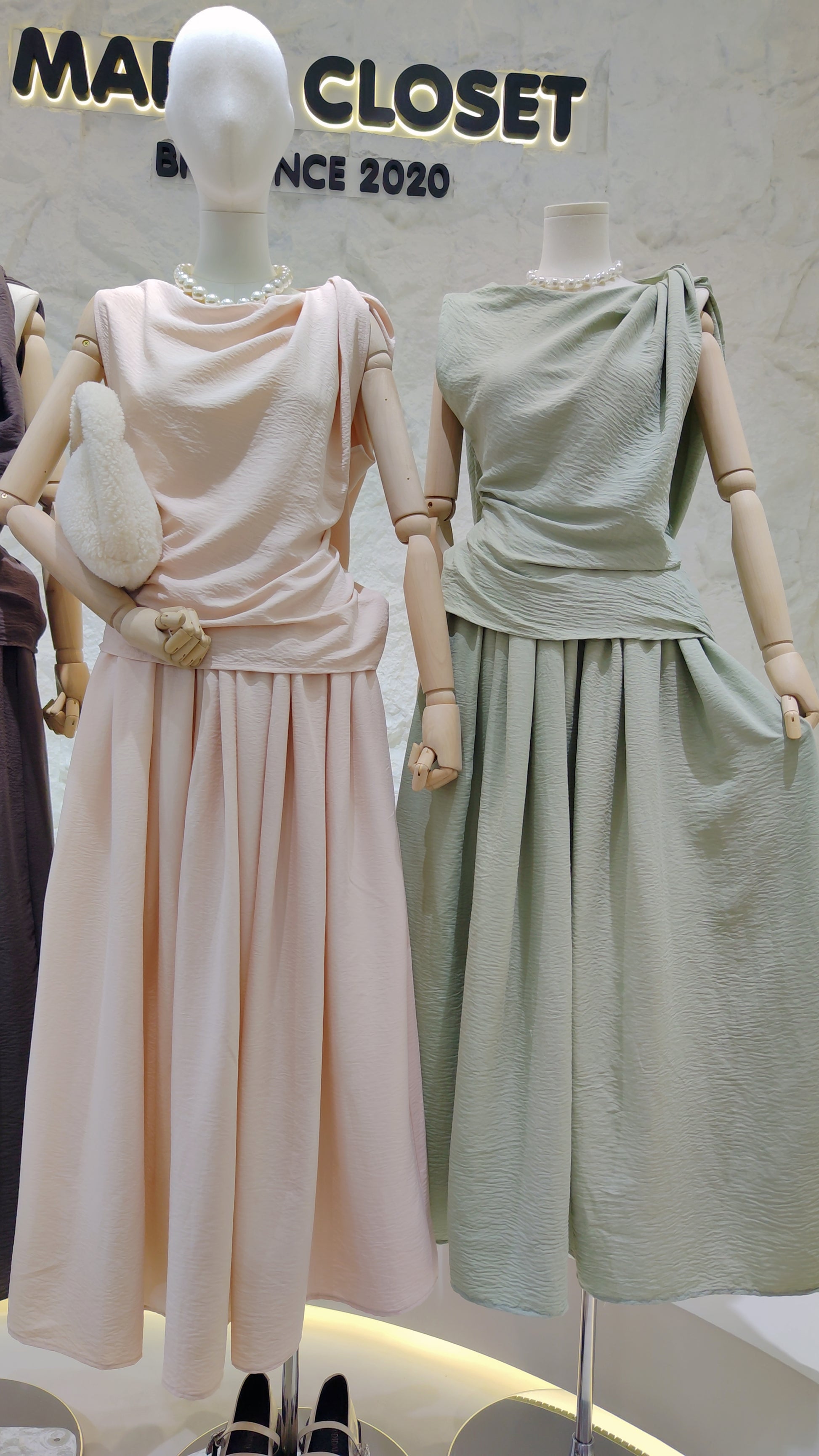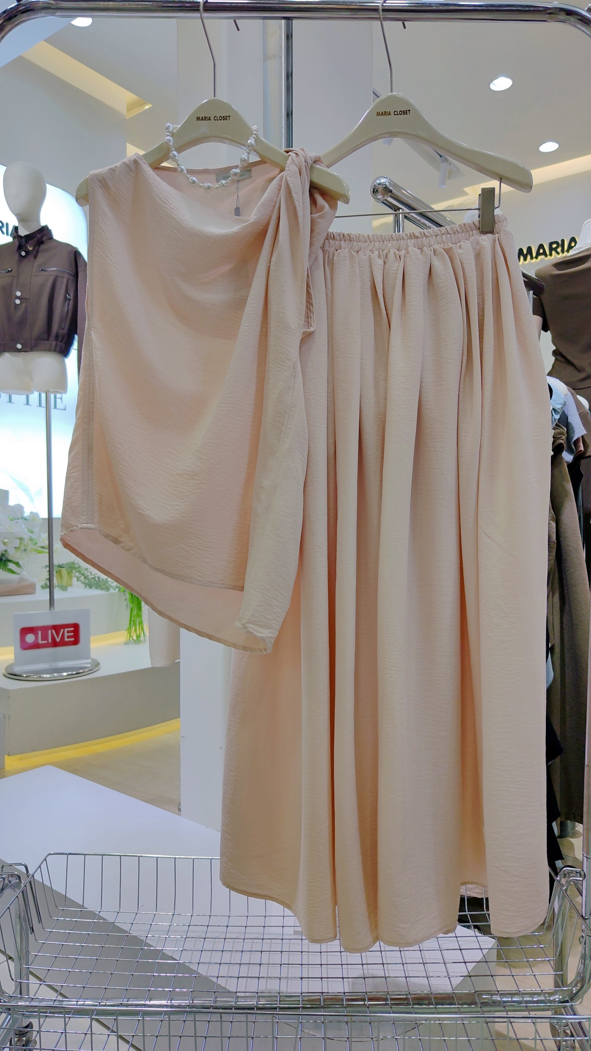 Details: A two-piece set. The sleeveless top features a dramatic, asymmetrical knot and drape detail on one shoulder. Paired with a matching high-waisted, A-line midi skirt with an elastic waistband.