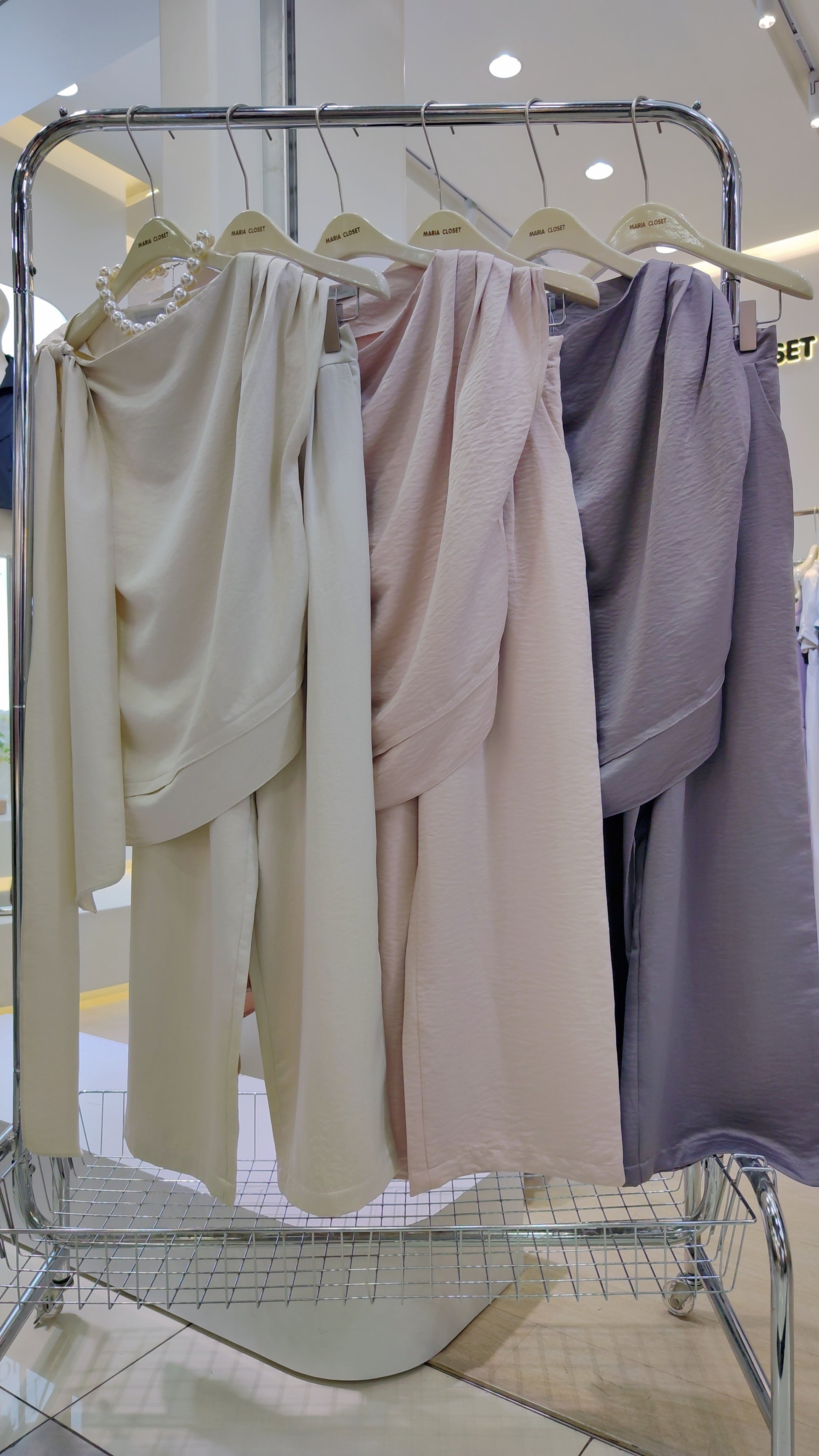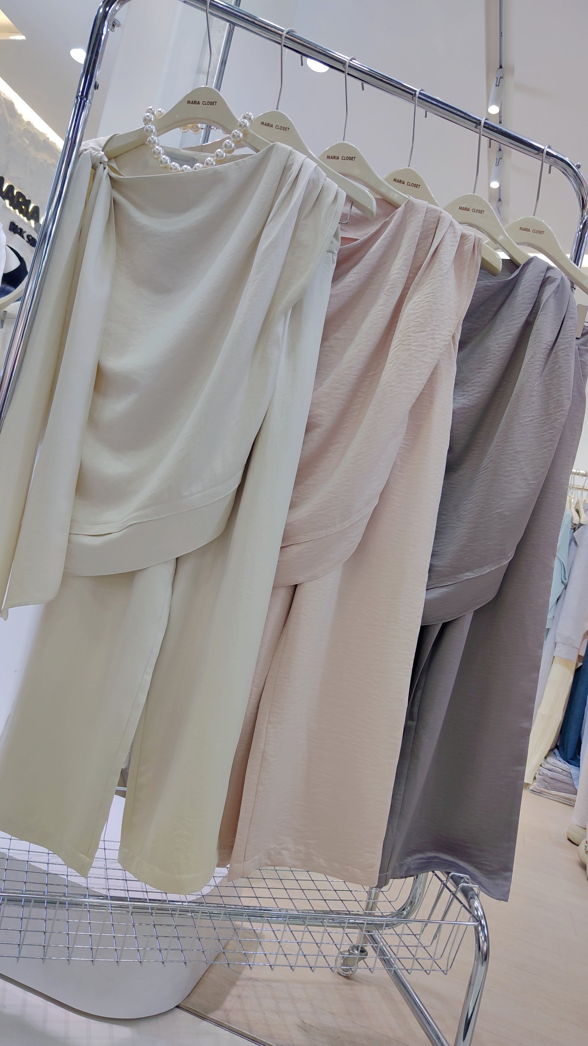 Details: A two-piece set including an asymmetrical one-shoulder top with a sculpted drape detail and a long side panel. The set is completed with matching high-waisted, wide-leg trousers.