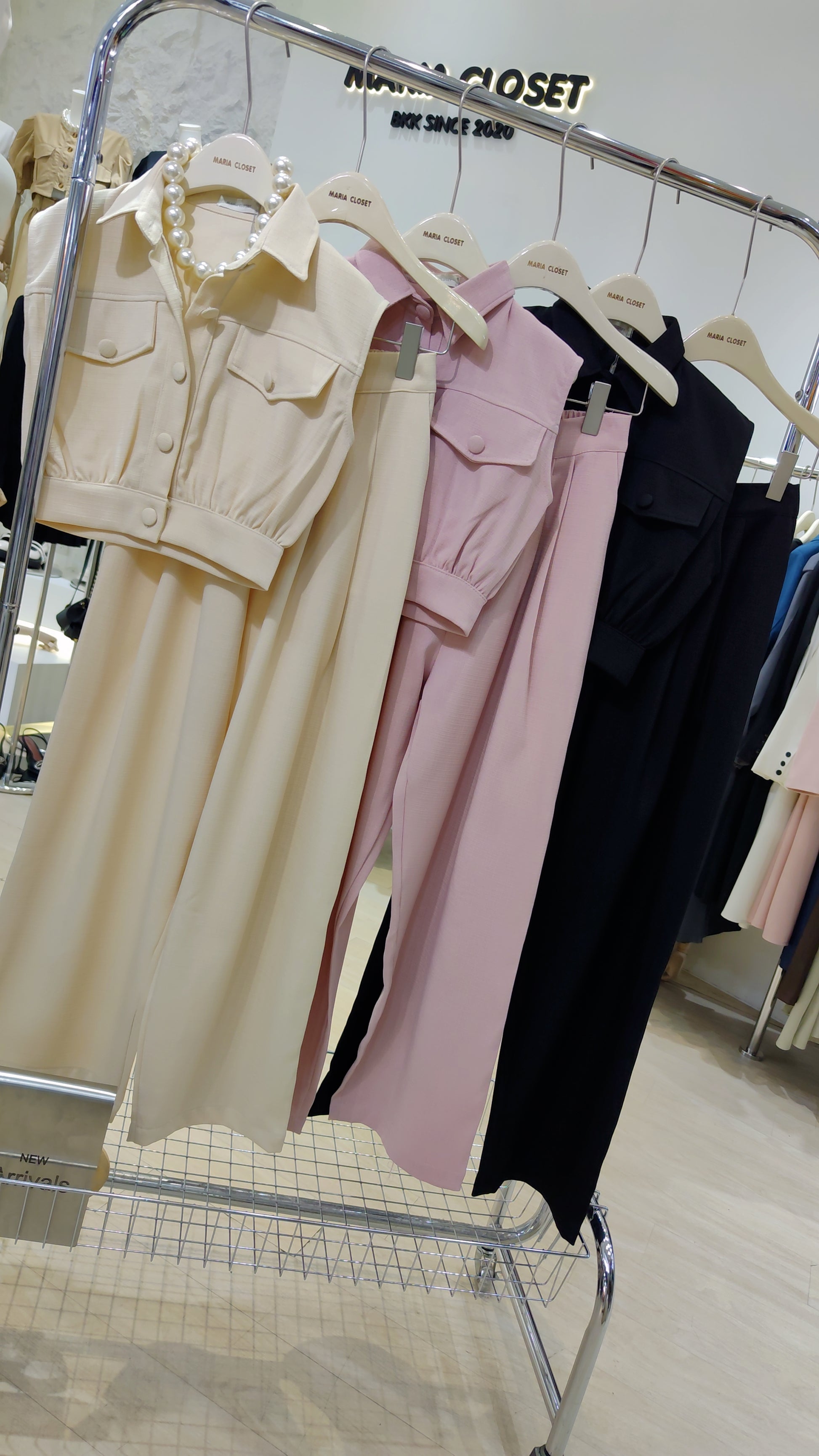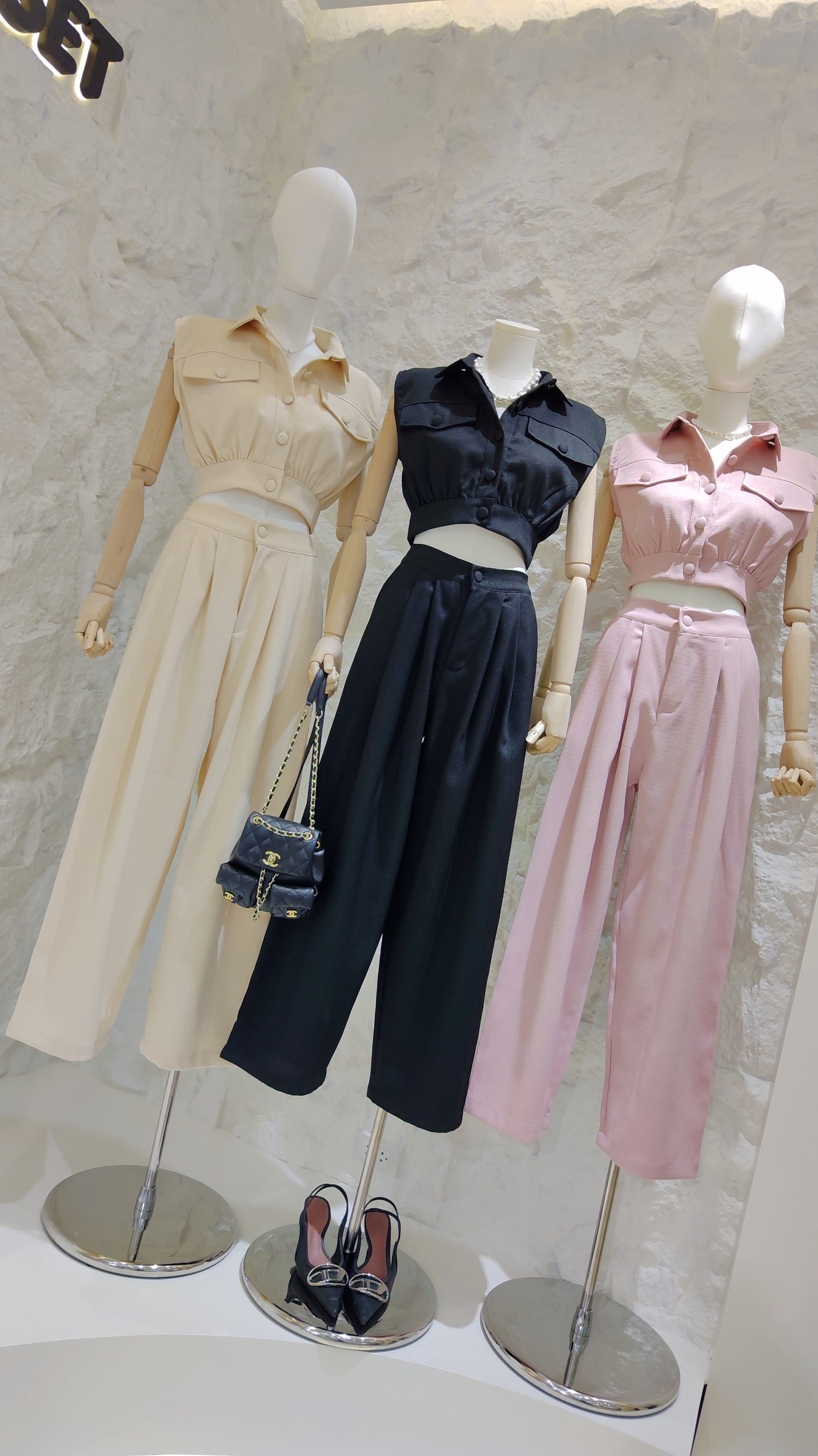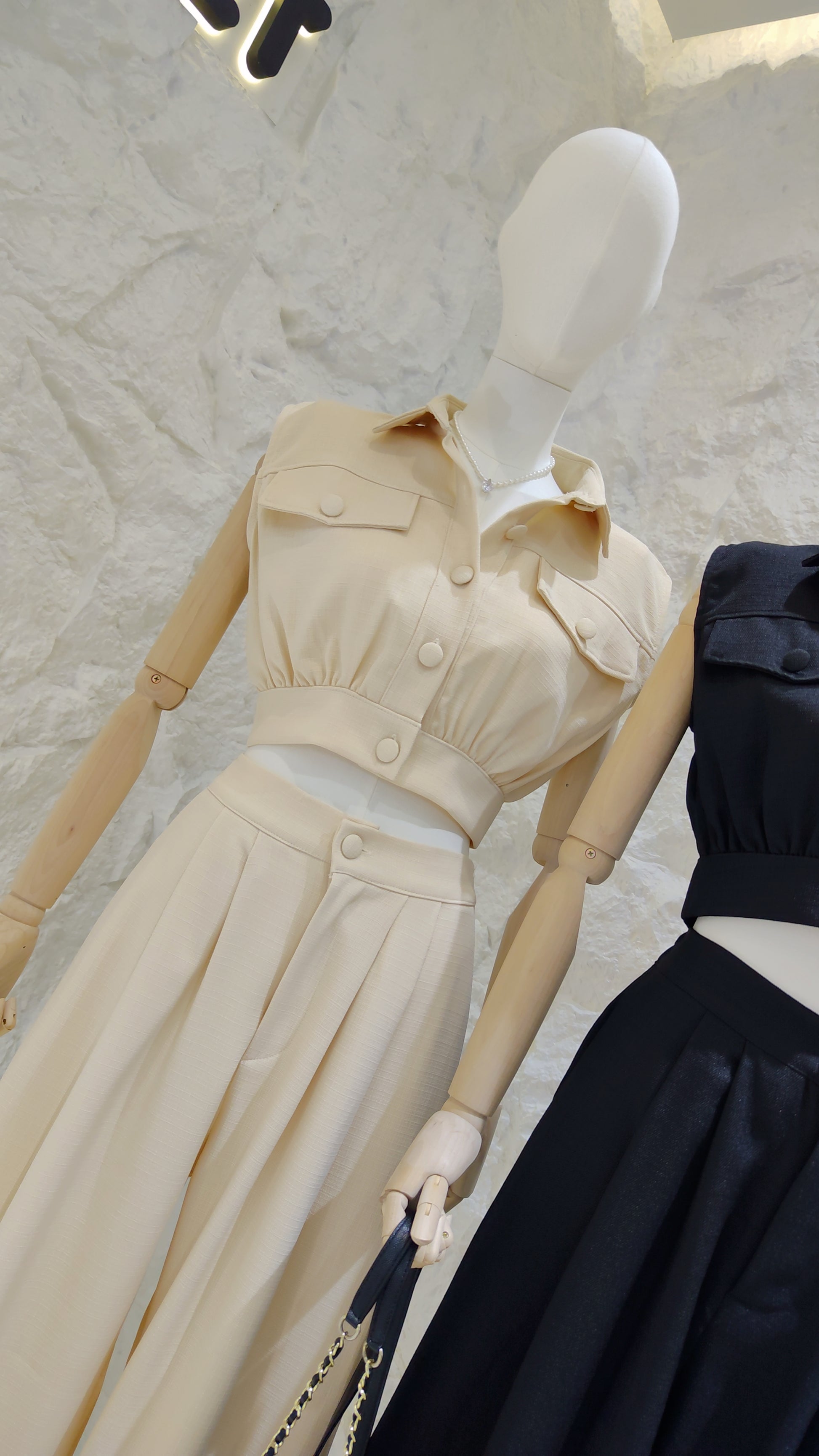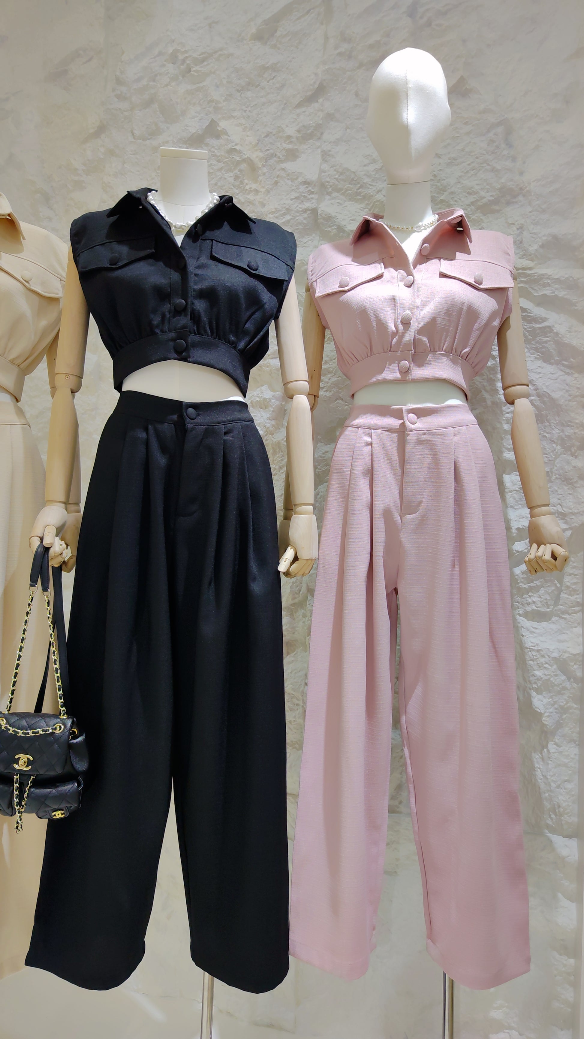 Details: A two-piece set crafted from tweed. Includes a sleeveless, cropped button-down top with a collar, chest flap pockets, and an elasticated hem. Paired with matching high-waisted, wide-leg trousers with front pleats.