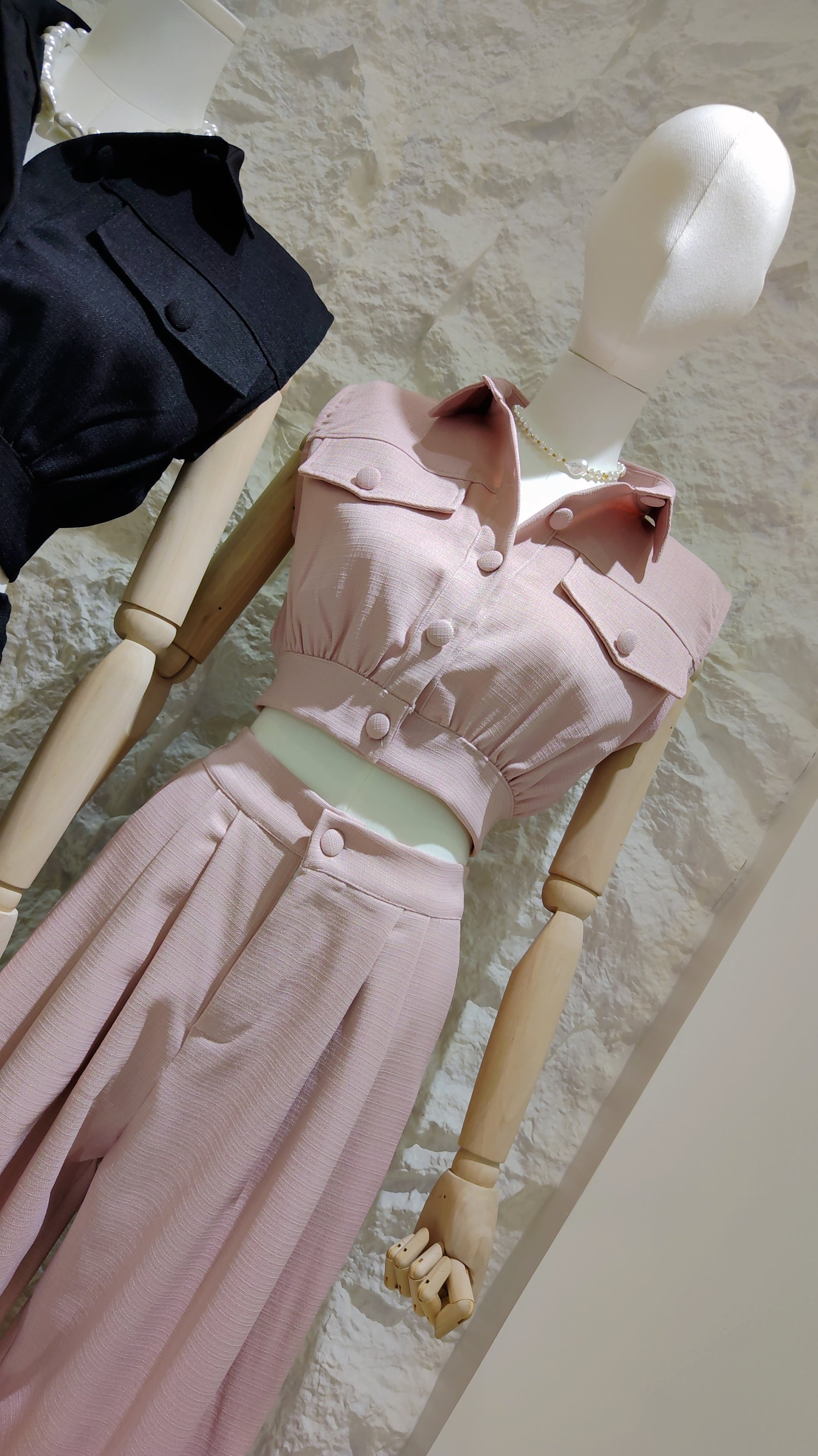 Experience timeless elegance with a modern twist in this sophisticated tweed two-piece set. The ensemble features a chic, sleeveless cropped top designed like a mini vest or shirt. It boasts a classic collar, a button-front closure, and functional chest flap pockets. The cropped silhouette is finished with a comfortable elasticated hem, creating a neat blouson shape. This top is paired with matching high-waisted, wide-leg trousers featuring flattering front pleats that add volume and graceful movement. Crafted entirely from a beautiful, textured tweed fabric, this set offers a luxurious feel and a polished look perfect for elevating your everyday style or for special occasions.