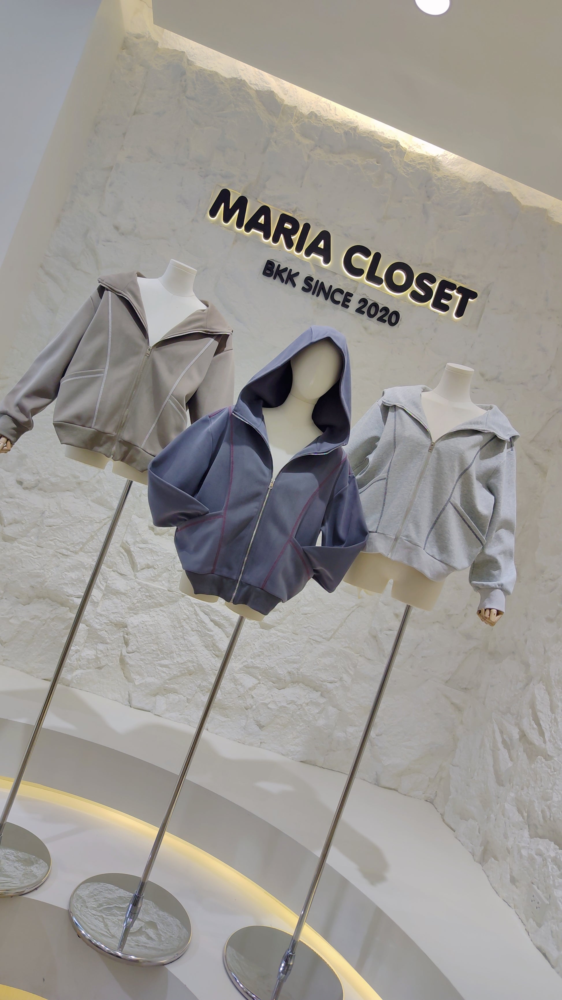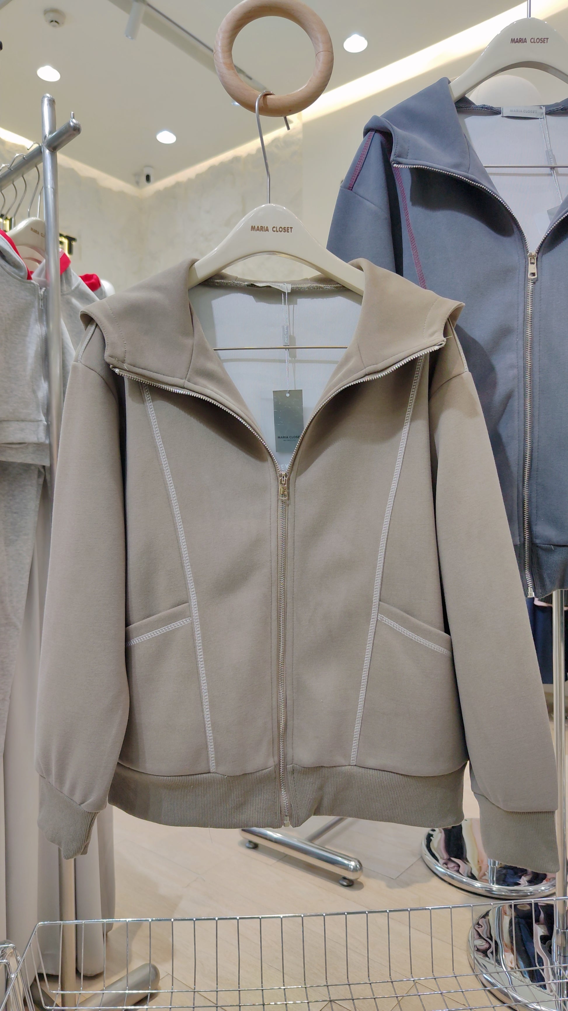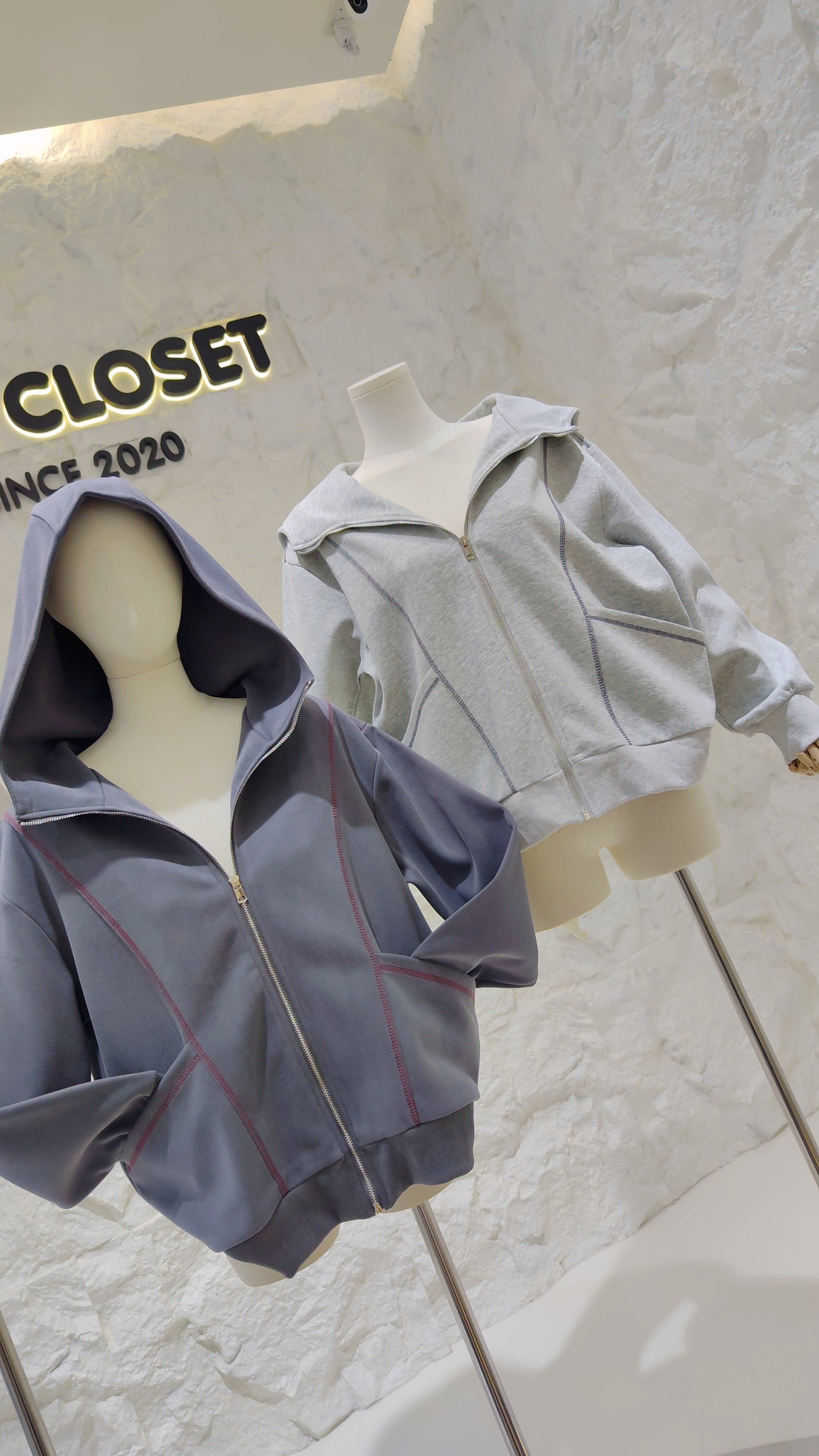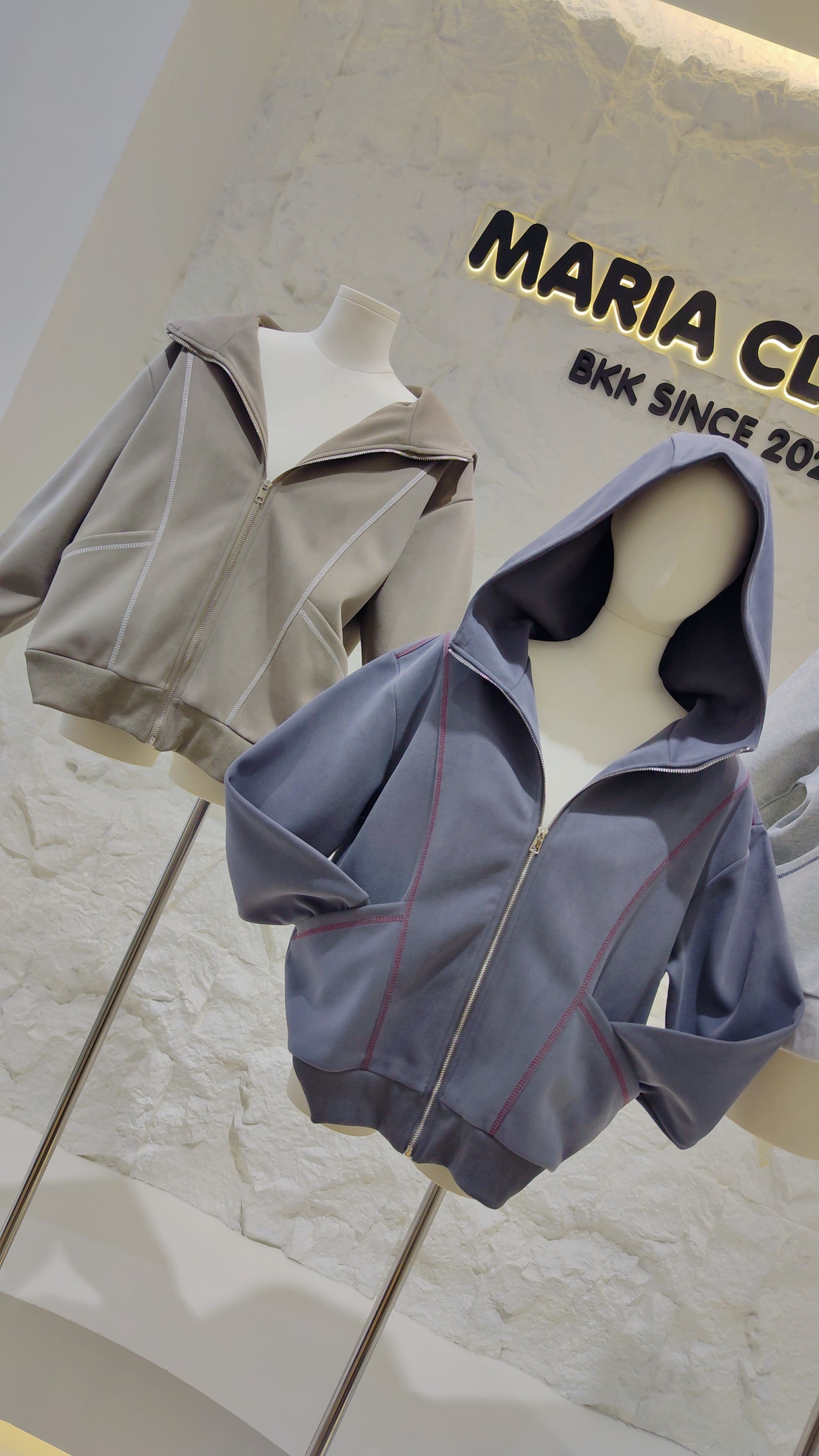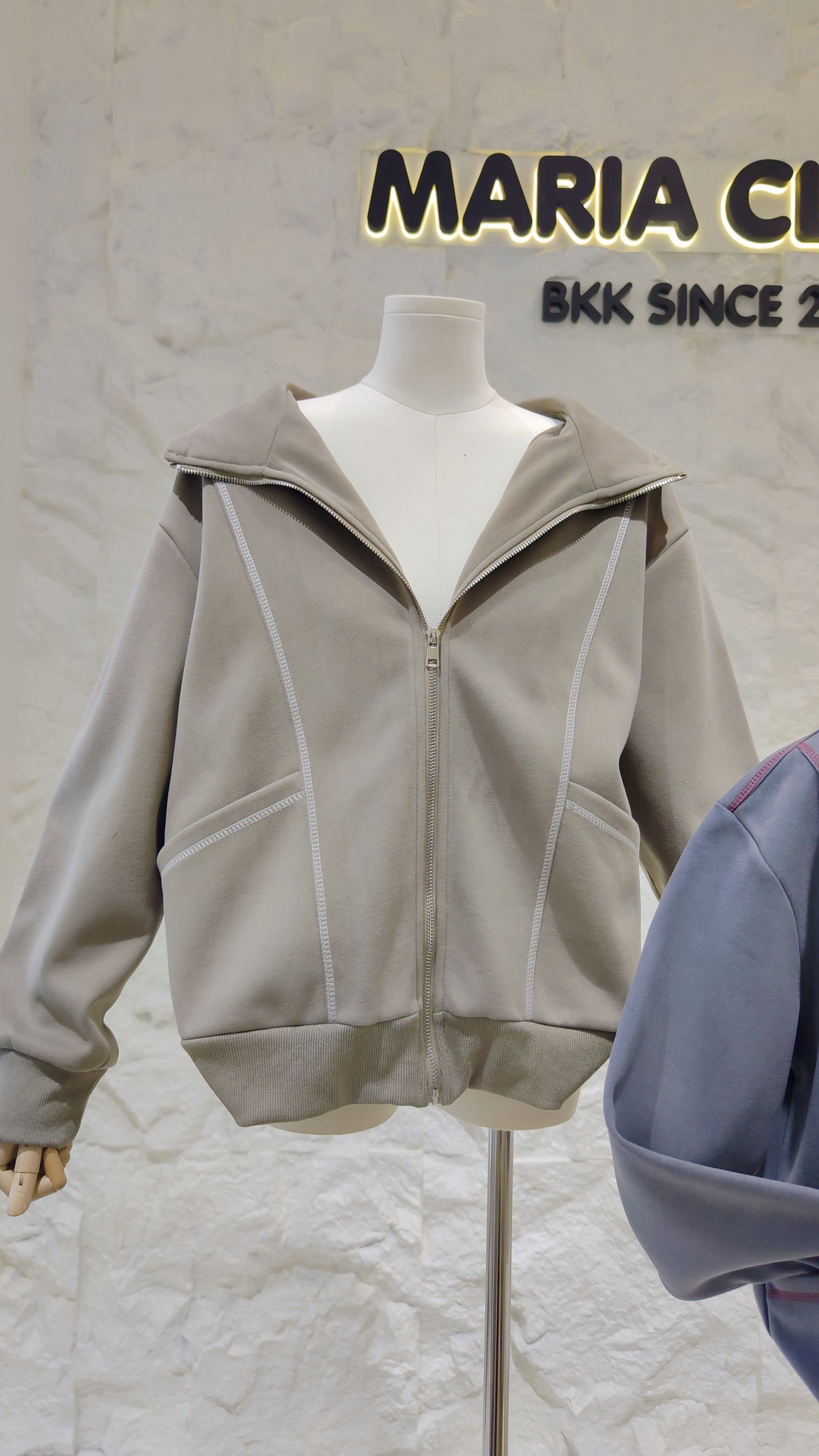 Details: A long-sleeved, full zip-up hoodie featuring bold contrast topstitching along curved seams and pockets. Designed with a large hood/wide collar, side pockets, and ribbed cuffs and hem.