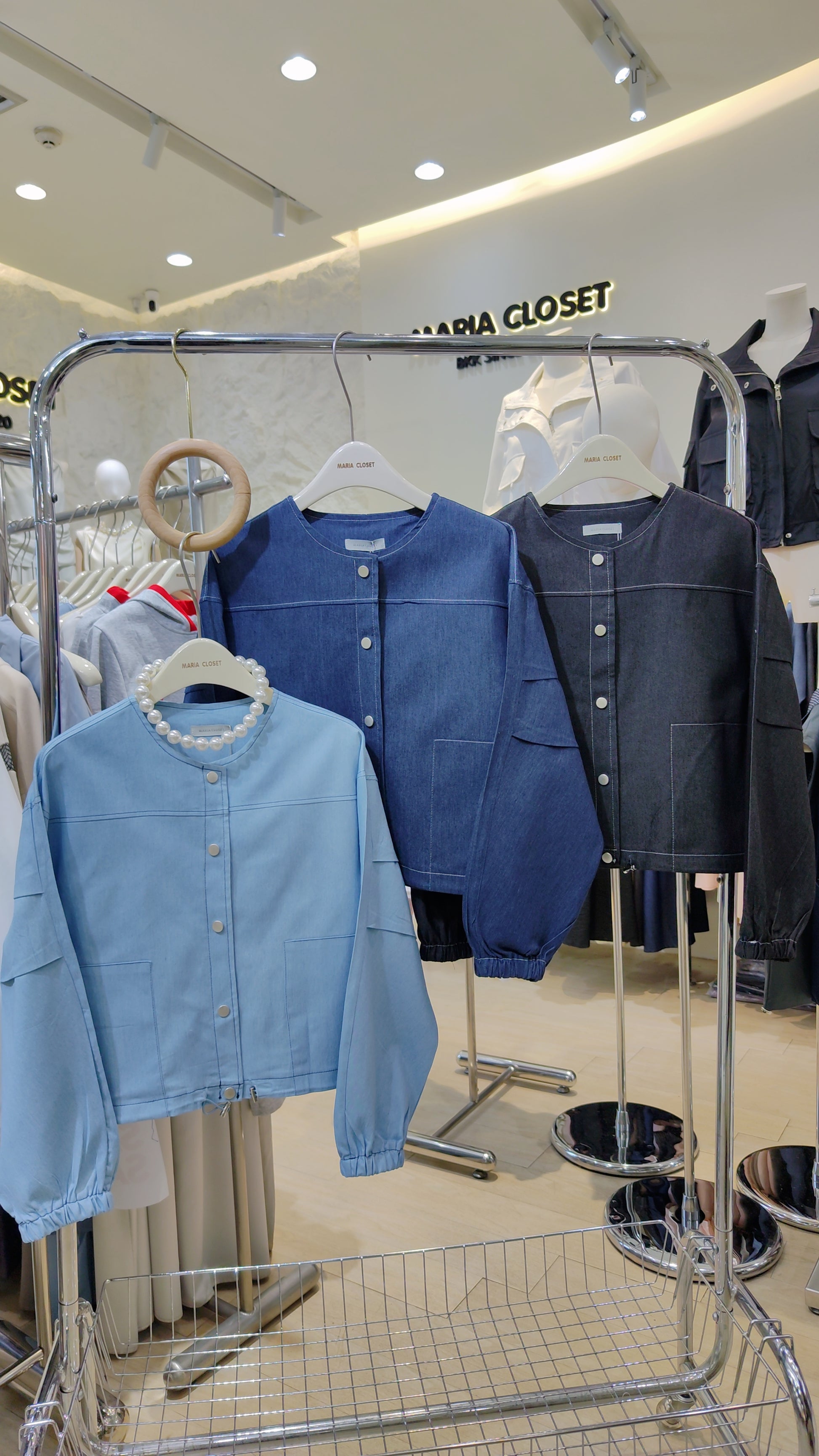 A modern take on the classic denim jacket, this cropped version is full of stylish details. It features a clean, collarless round neckline, a snap-button front, and distinctive contrast topstitching that highlights the seams and pocket placements for a cool, graphic look. Designed with a relaxed, slightly boxy fit, it has long sleeves with comfortable elasticated cuffs and an adjustable drawstring hem, allowing you to cinch the silhouette for a more blouson shape. Crafted from a lightweight denim or chambray-like fabric, this jacket is the perfect versatile layer for adding a touch of casual cool to any outfit.