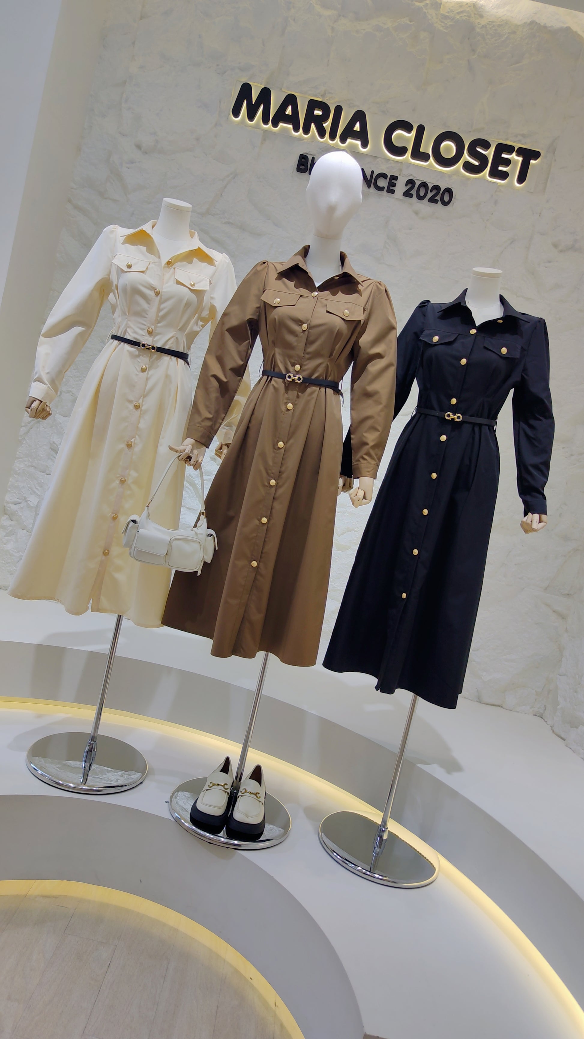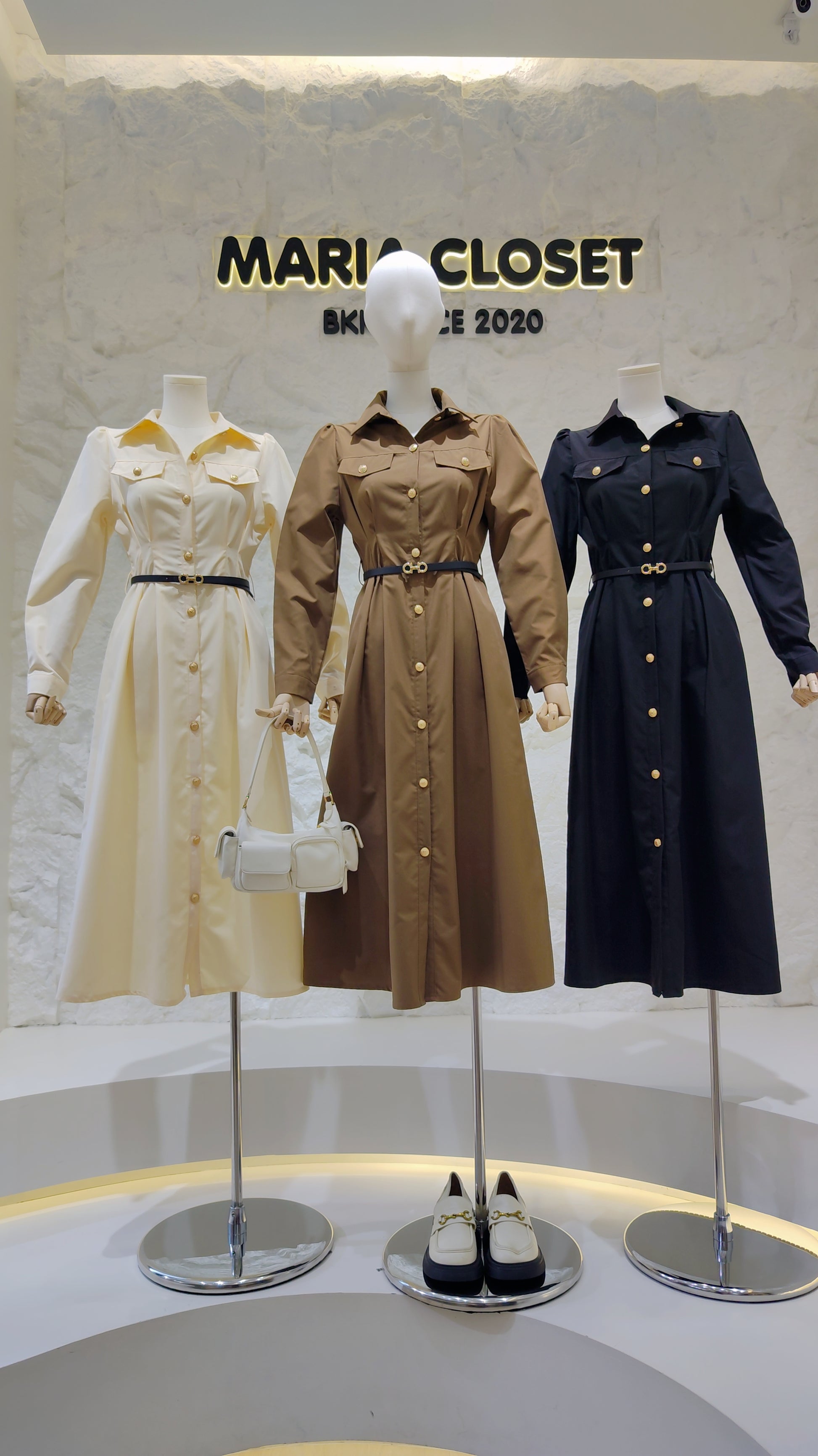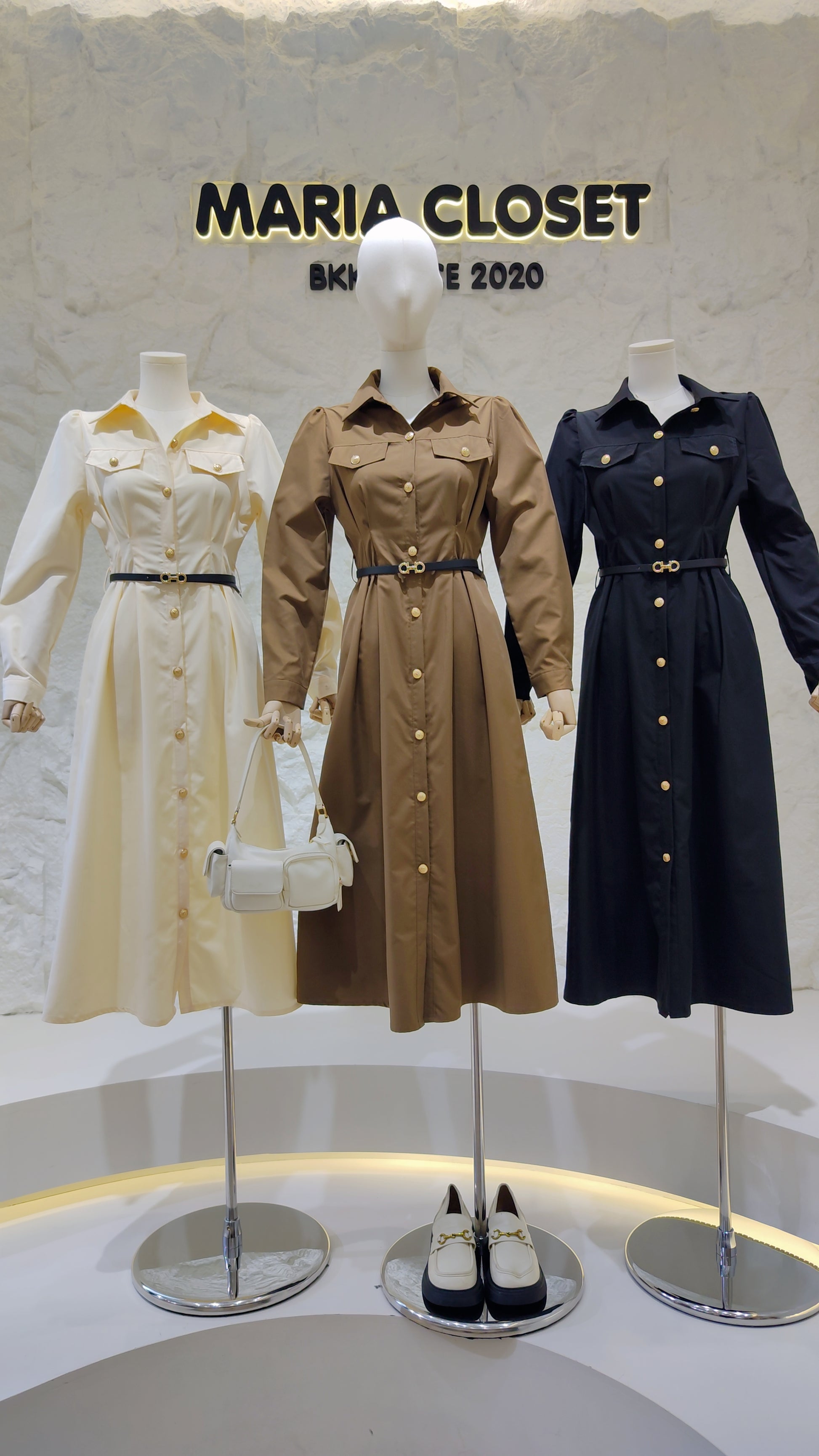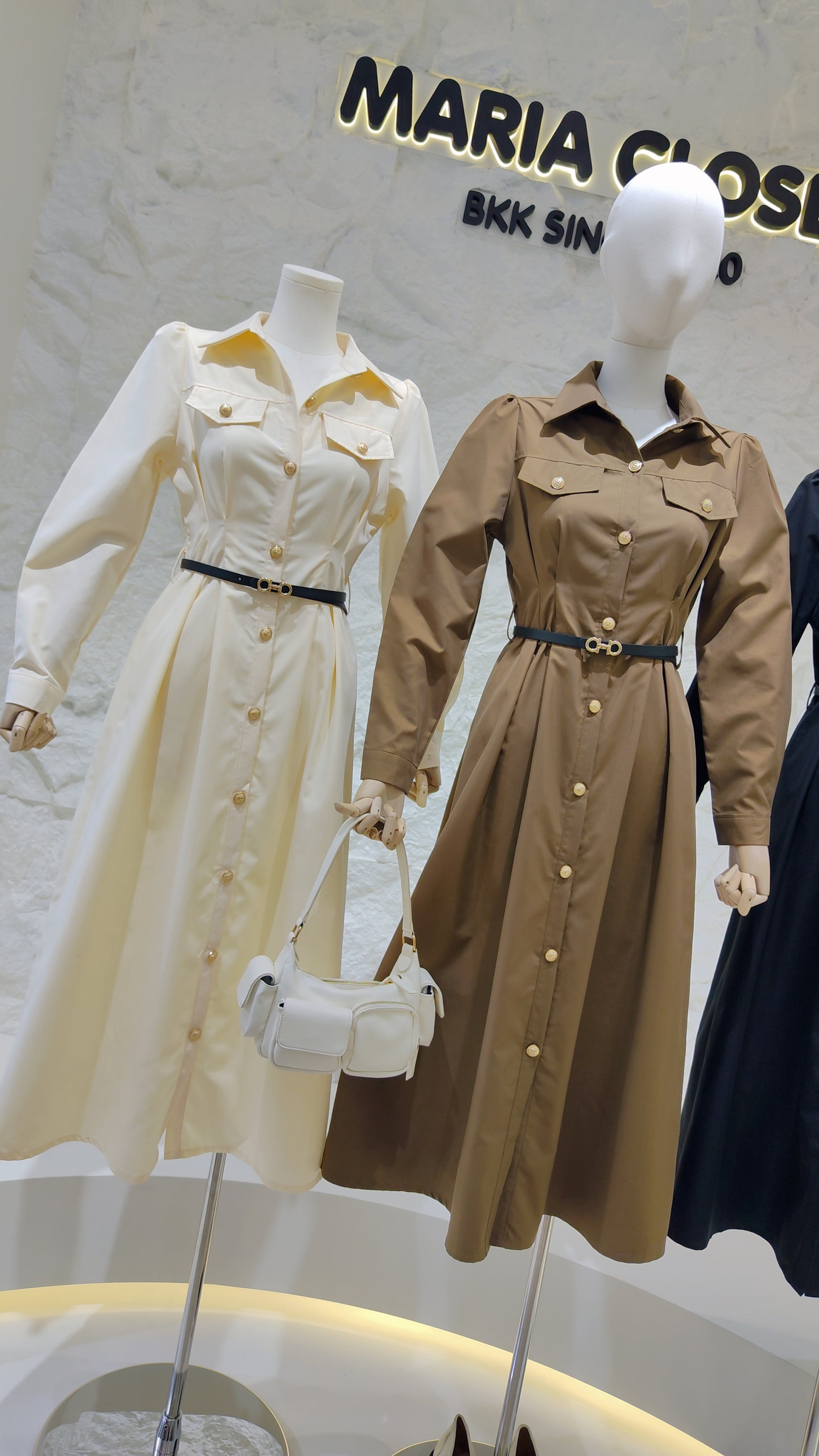 Details: A long-sleeve, button-down midi shirt dress. Features a classic collar, gold buttons, two chest flap pockets, a pleated A-line skirt, and includes a matching detachable belt.