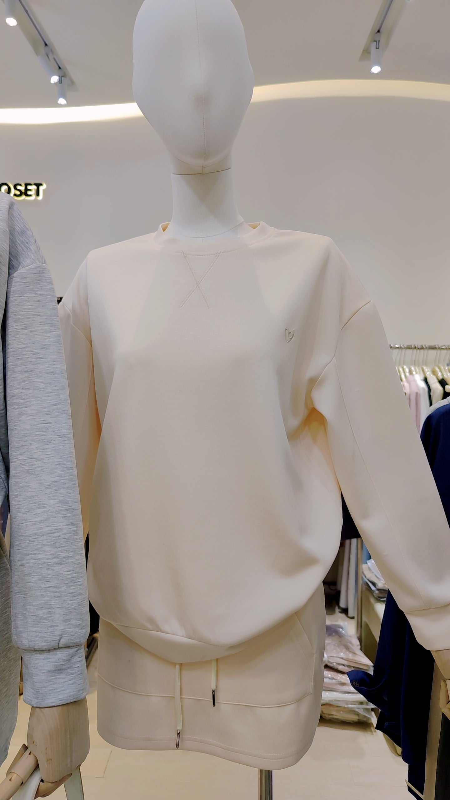 Your new go-to for cozy, cute, and casual days. This adorable two-piece lounge set is crafted from an incredibly soft jersey fleece. The set features a relaxed, oversized crewneck sweatshirt with drop shoulders and a subtle, minimalist heart embroidered on the chest. It's perfectly paired with a matching high-waisted mini skirt, complete with a comfortable drawstring waist, side pockets, and a sporty silhouette. It's the ultimate ensemble for a coffee run, lounging at home, or a casual day out.