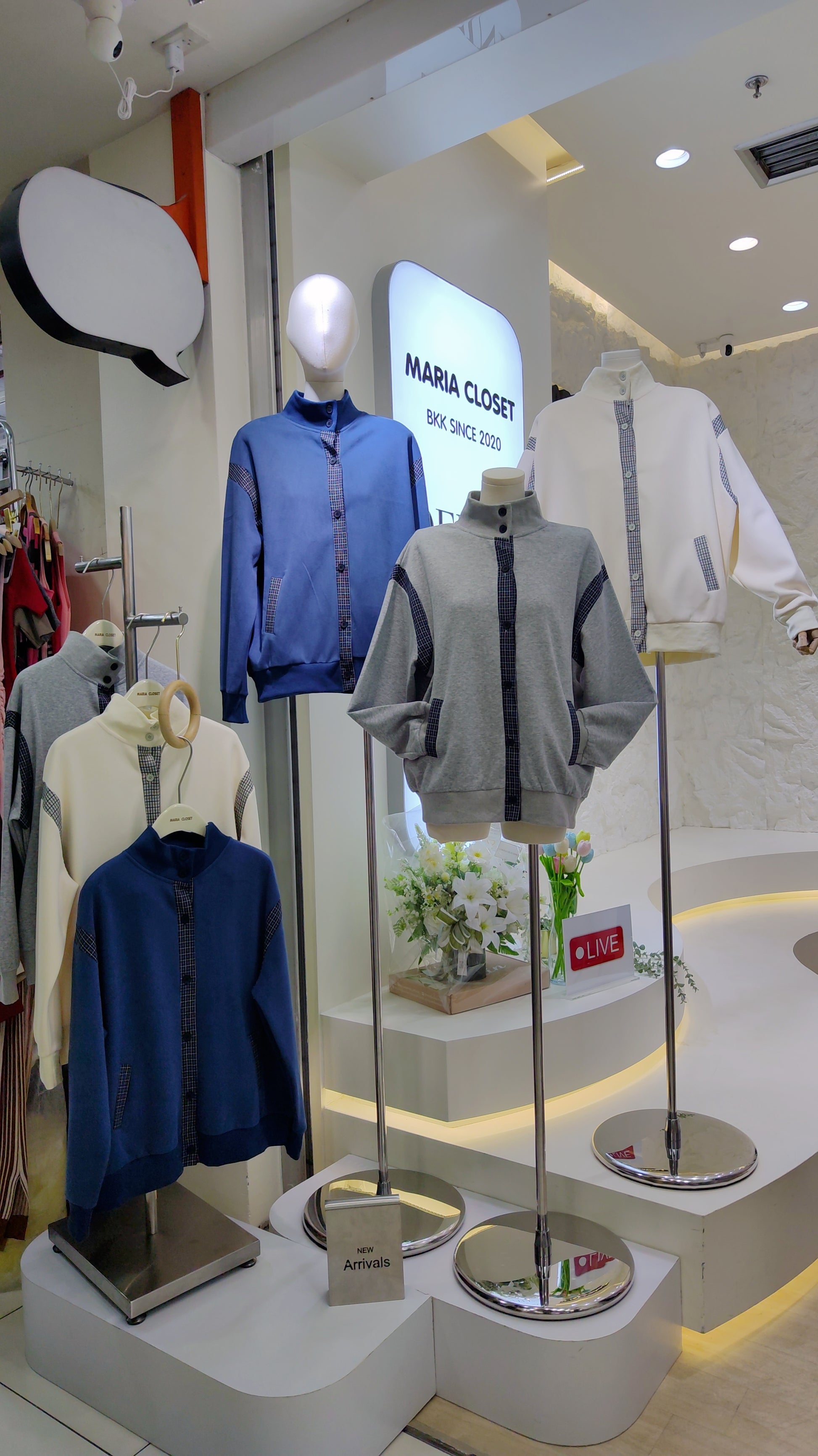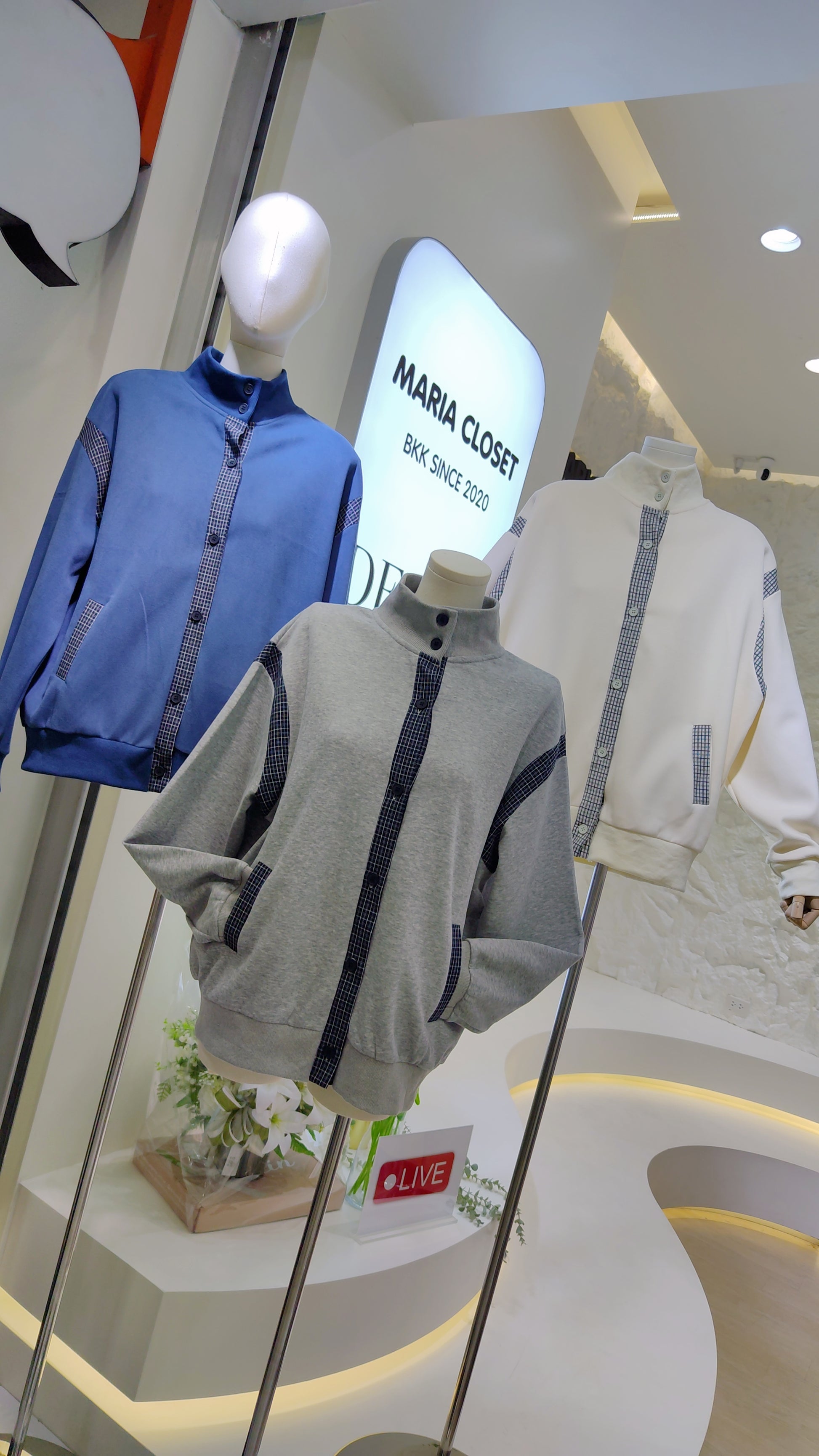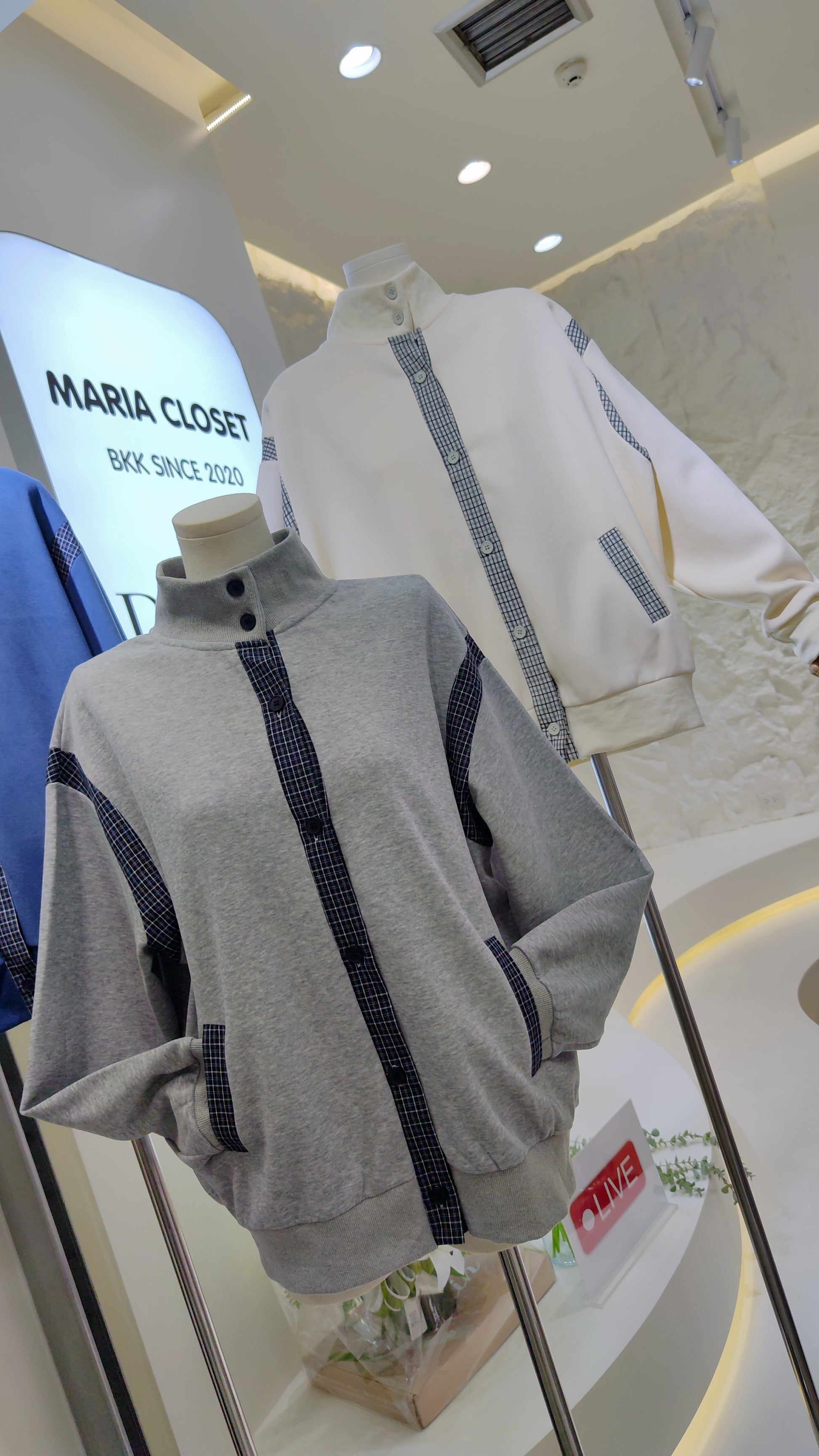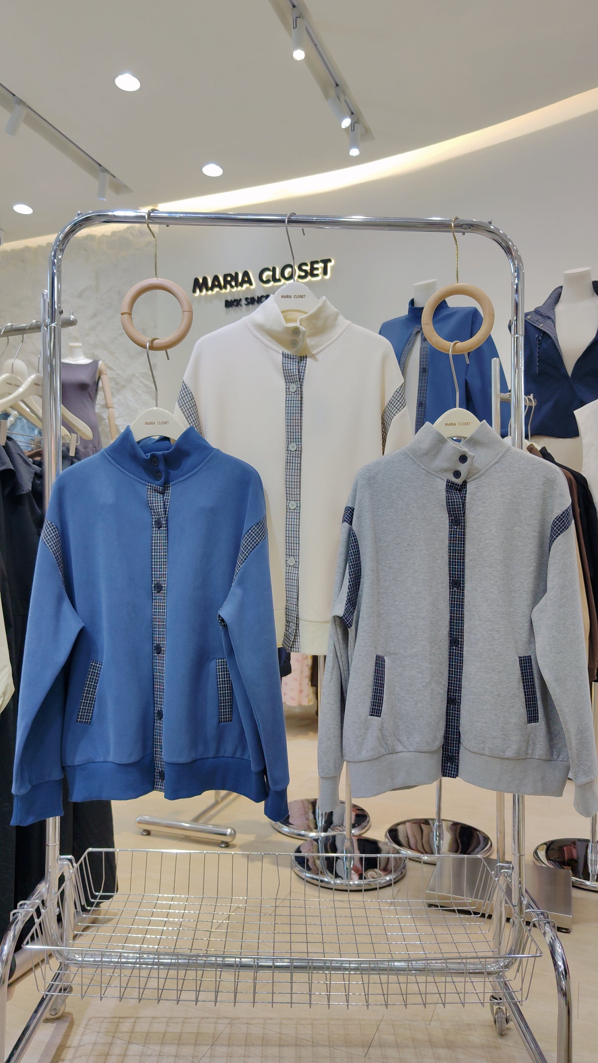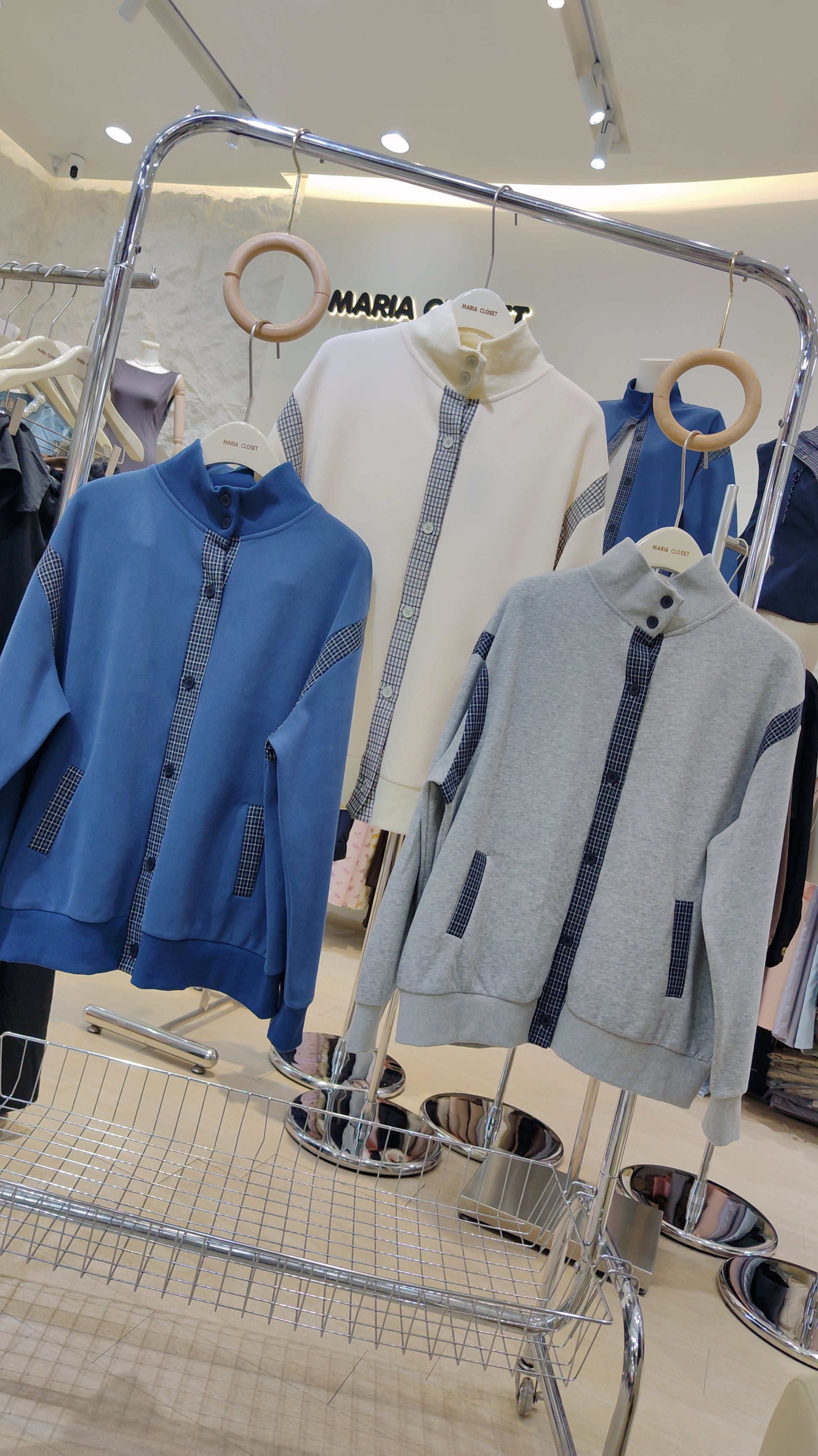 Details: A long-sleeved, button-front bomber-style jacket. Features contrasting plaid trim on the button placket, pocket welts, and shoulder/sleeve panels. Designed with a high stand-up collar and ribbed cuffs and hem.