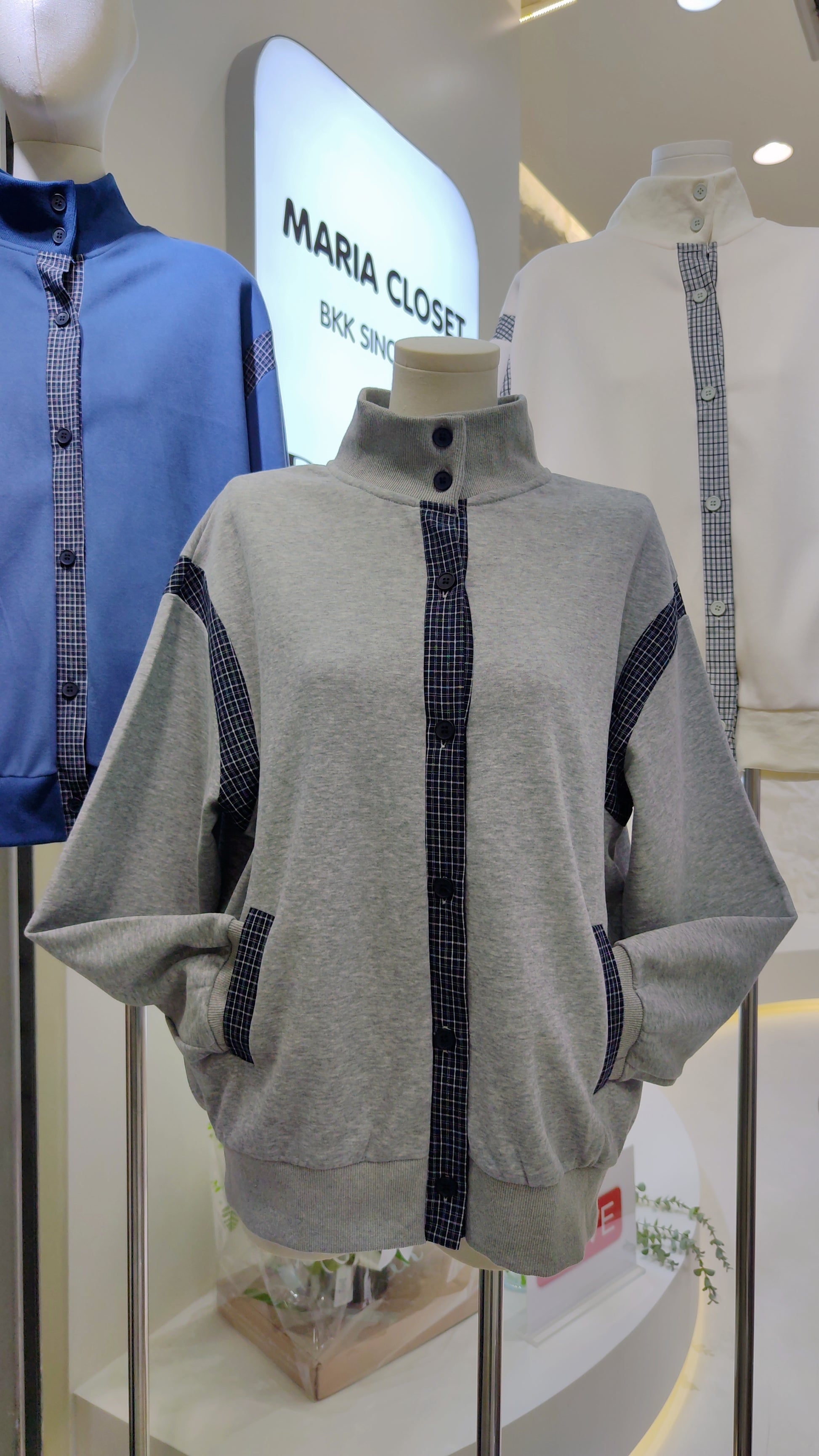 Classic collegiate style meets modern comfort in this must-have sweatshirt jacket. The standout feature is the charming plaid-print trim that elegantly details the button placket, pocket welts, and shoulder panels. This preppy-inspired contrast adds a touch of academic chic to the relaxed, sporty silhouette. Designed with a high stand-up collar and a comfortable, oversized blouson fit, this jacket is perfect for easy layering. It features a full button-front closure, ribbed cuffs and hem, and two functional front pockets. Crafted from a soft, mid-weight jersey fleece, it offers the comfort of your favorite sweatshirt in a stylish jacket form.